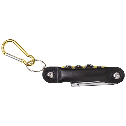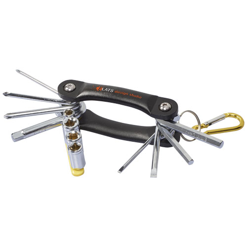 Tycoon 12 Funktionen Multifunktionswerkzeug. Multifunktionswerkzeug mit 12 Funktionen. 3 Kreuz- und 2 Flachschraubendreher, 2 Sechskantschlüssel aus Karbon-Stahl mit Chrom-Überzug. Inkl. farbigem Adapter mit 4 Fassungen und farblich passendem Karabiner (nicht zum Klettern geeignet). Aluminium.