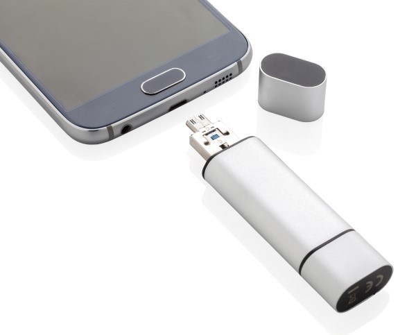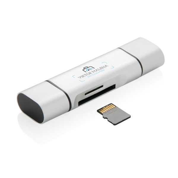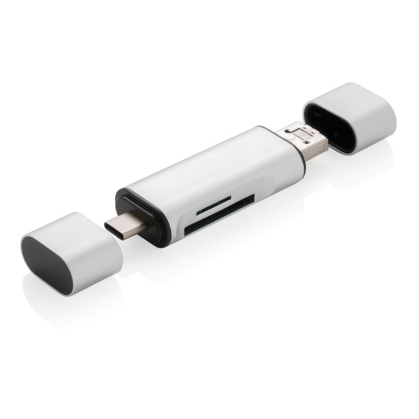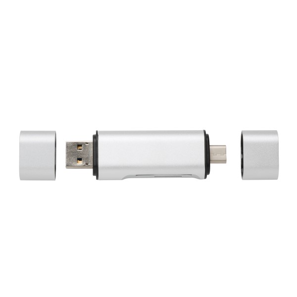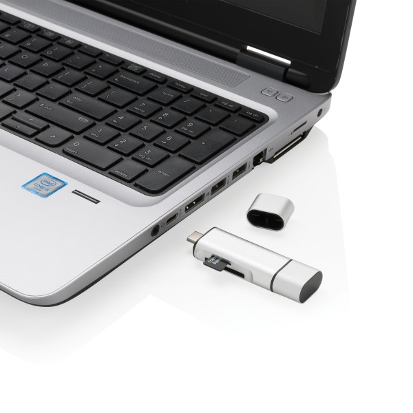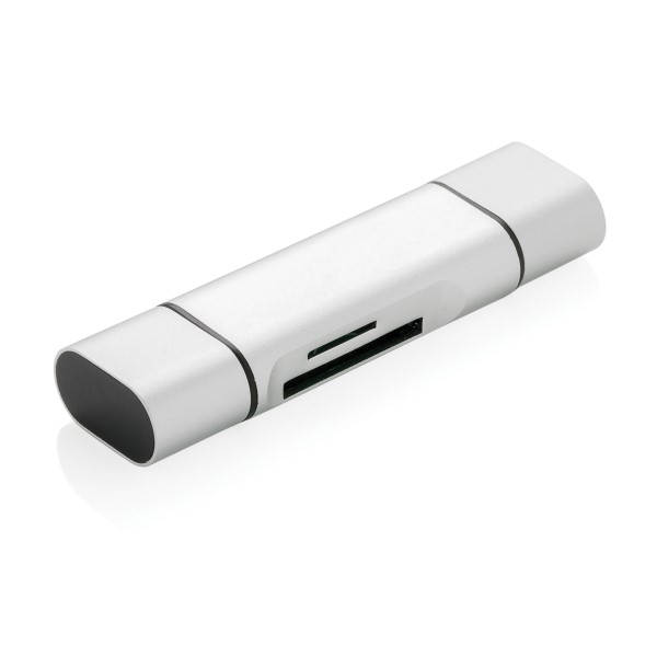3-in-1 Unisversal Kartenleser mit USB 2.0, Type C und OTG Micro-USB-Anschluß. Somit kann er nicht nur mit Computern sondern auch mit Smartphones und Tablets, die einen Micro-USB oder Type C Anschluß haben, verwendet werden. Gehäuse aus Aluminium.