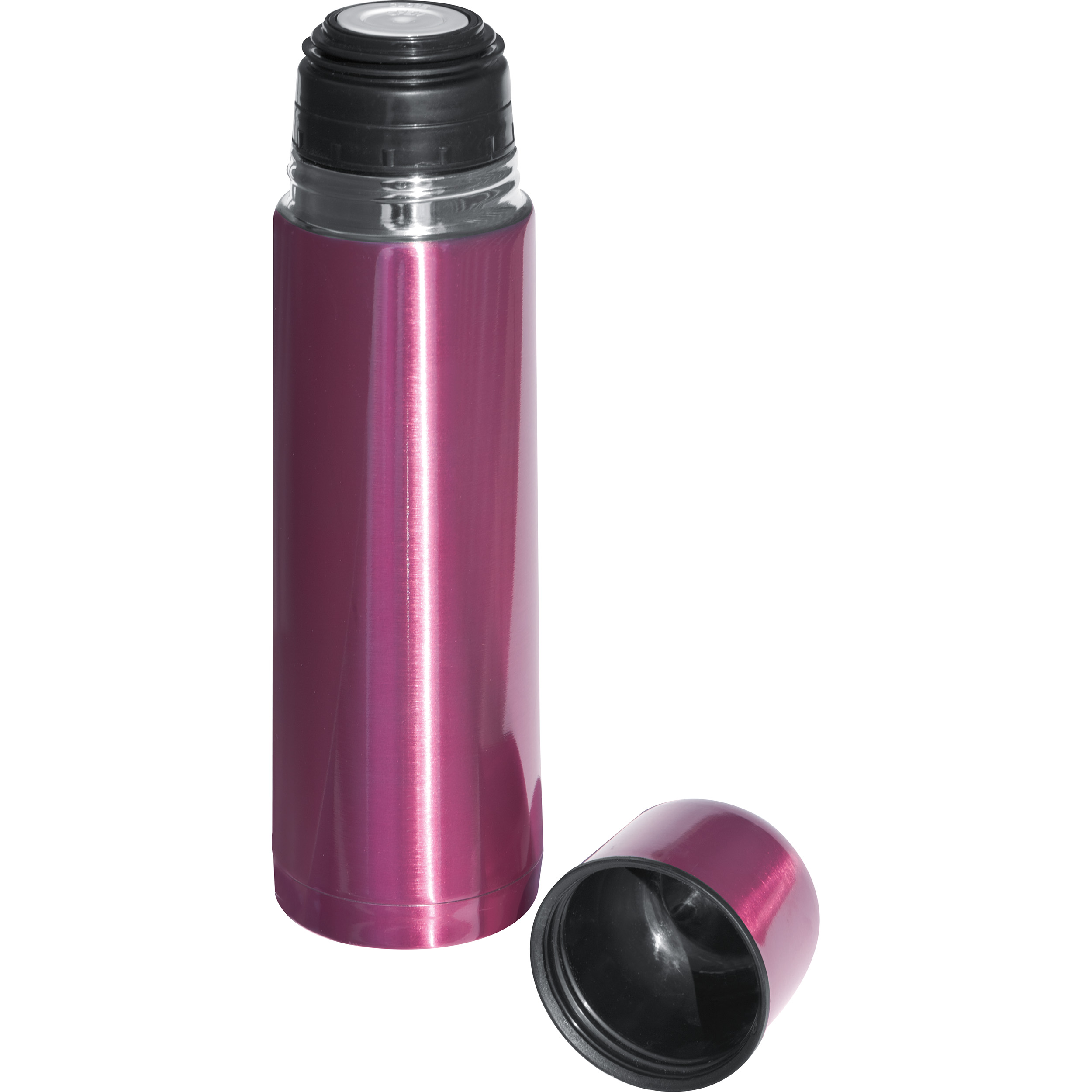 Doppelwandige Isolierkanne aus Edelstahl mit 500 ml Fassungsvermögen, Schnellverschluss und Metallbecher in trendigen Farben. Die Werbung wird auf die Kanne gelasert.