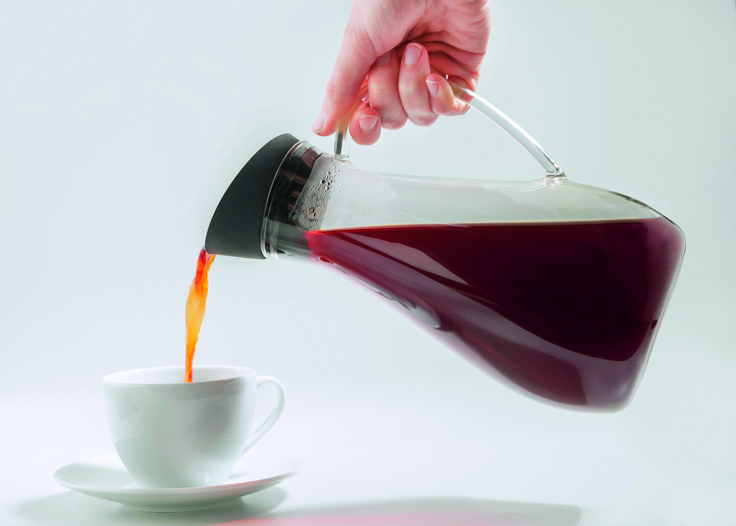 Thermo-Glaskaraffe mit Teebereiter bzw. Eiswürfelröhre für heißen oder eiskalten Genuss. Tempered Glas, LFGB-konform, 2.000ml, VPE 4. Automatikausgießer, Designkarton