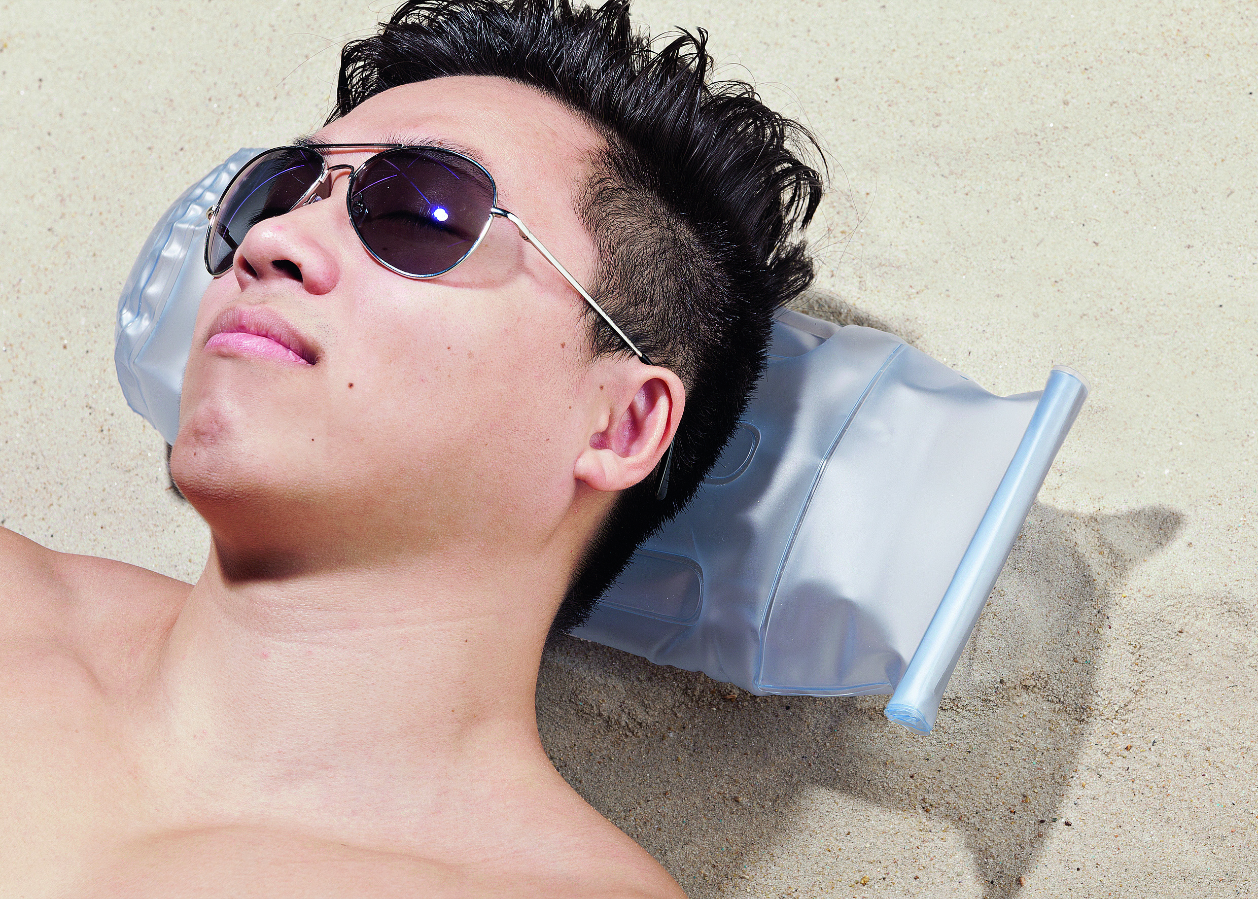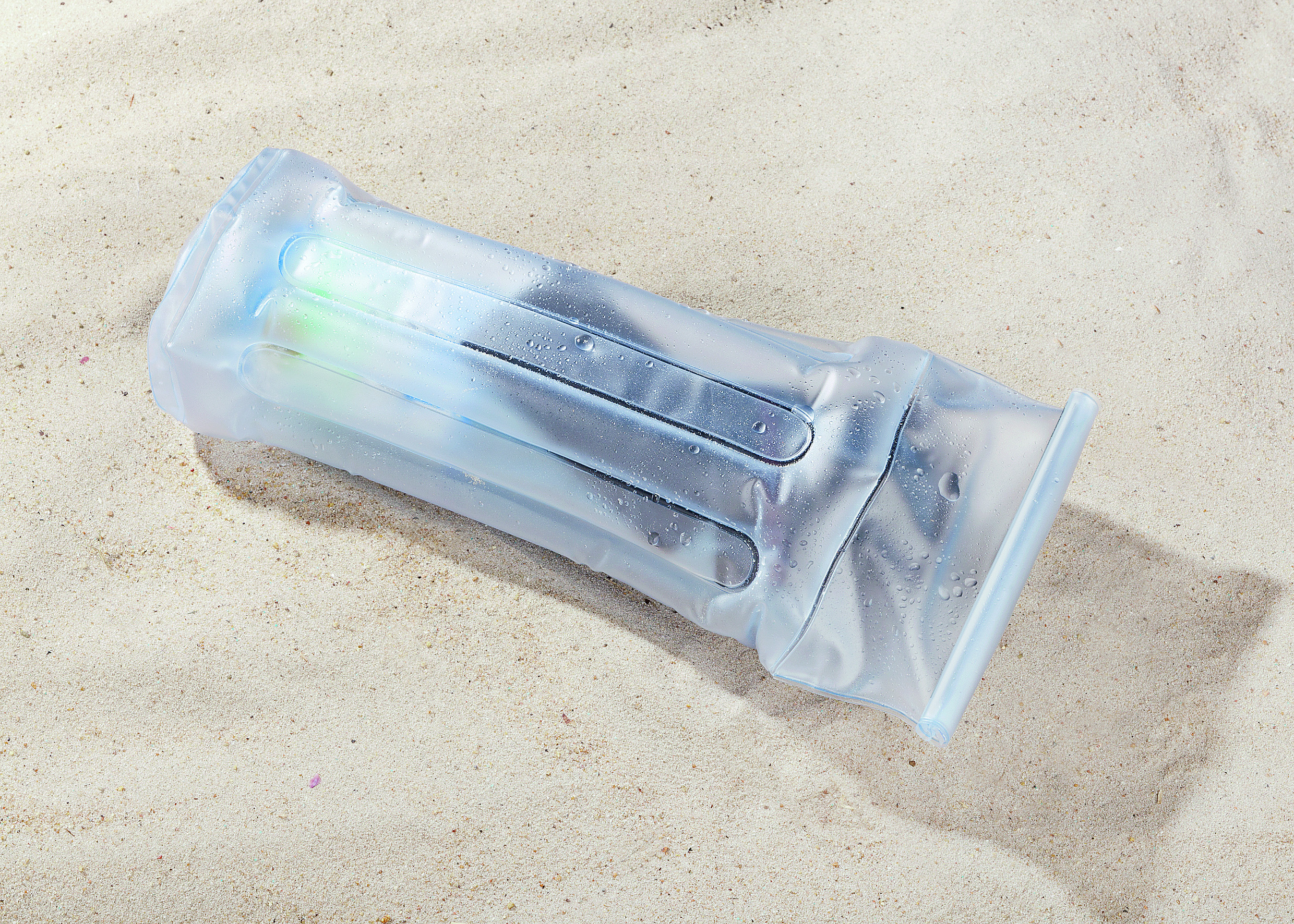 Aufblasbare Tasche für Wertsachen, Flaschen, etc. und gleichzeitig ein Reisekopfkissen. Vor Spritzwasser schützend, VPE 100. Designkarton