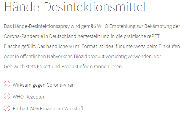 Das Hände-Desinfektionsmittel wird gemäß WHO Empfehlung zur Bekämpfung der Corona-Pandemie in Deutschland hergestellt und in die praktische rePET Flasche gefüllt. Das handliche 50 ml Format ist ideal für unterwegs beim Einkaufen oder in öffentlichen Nahverkehr. Biozidprodukt vorsichtig verwenden. Vor Gebrauch stets Etikett und Produktinformationen lesen.