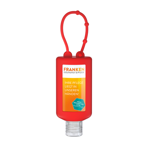50 ml PET Flasche mit Klappdeckel. Leicht zu öffnen und sauber wieder zu verschließen. Das Desinfektionsmittel für die Hände ist der ideale Begleiter im Alltag. Prompt und einfach ohne Wasser anwendbar Hergestellt in Deutschland. Das 50 ml Fläschchen Desinfektionsmiitel mit verschiedenfarbigen Silikonhüllen ist nicht nur optisch ein echter Hingucker! Praktisch mit Schlaufe zum Anhängen an den Rucksack, Kinderwagen oder für unterwegs. Die Verwendungsmöglichkeiten sind zahlreich. Erhältlich in 5 Farben frost, balu, rot, grün, schwarz. Die bunten Silikonhüllen passen sich wunderbar Ihrem Design an.