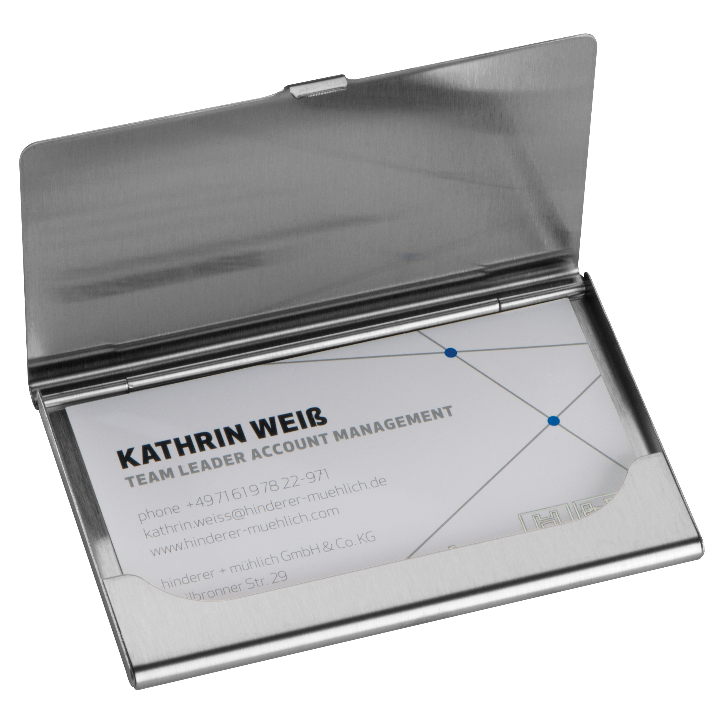 Visitenkartenetui aus Metall. Dieses robuste Etui schützt Ihre Karten vor Beschädigungen. Der Deckel bietet ausreichend Platz für eine Lasergravur.