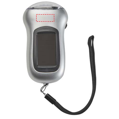 Kompakte Solartaschenlampe mit einer Leuchtstärke von 10.000 mcd. Die Taschenlampe kann durch Drehen des Griffs auch manuell betrieben werden.