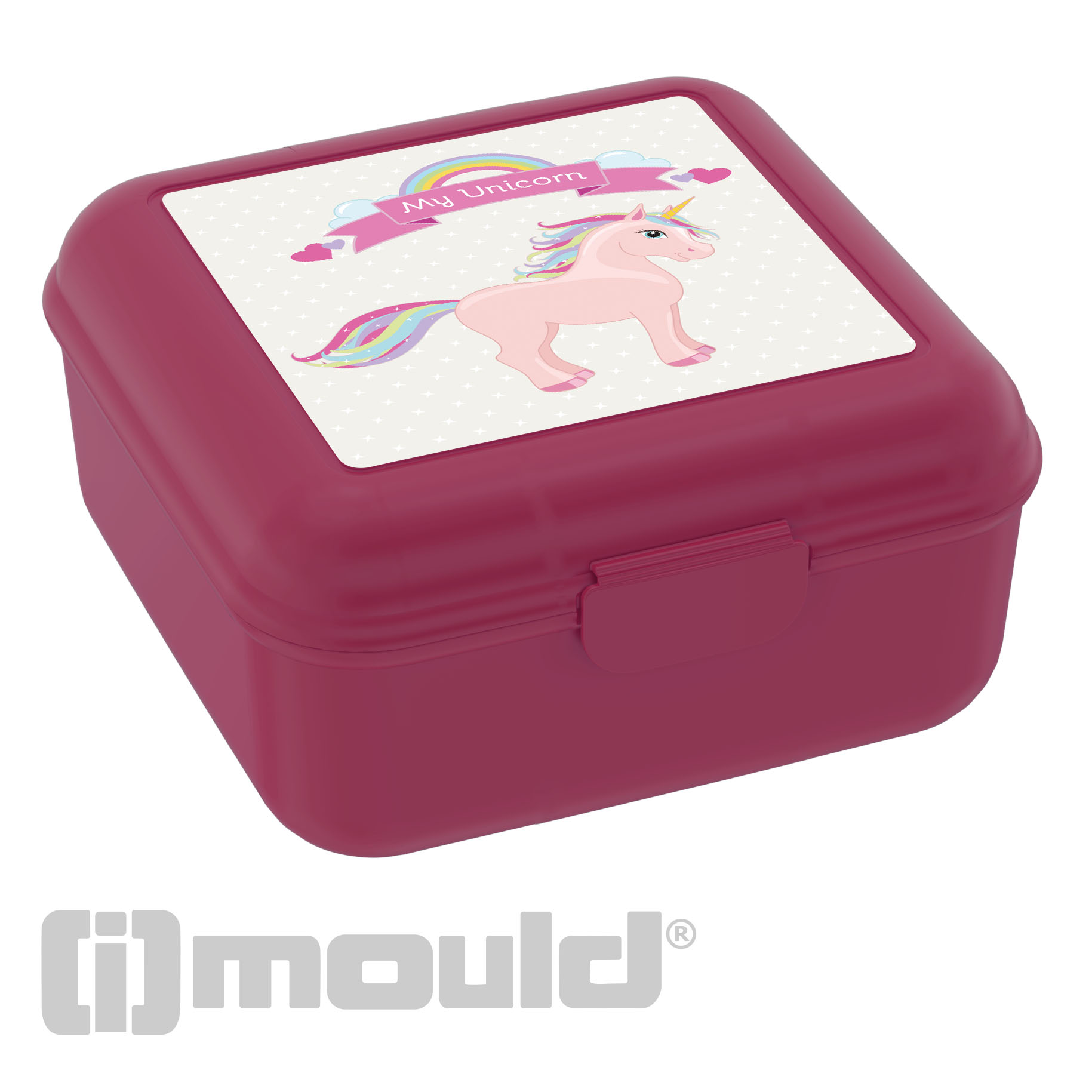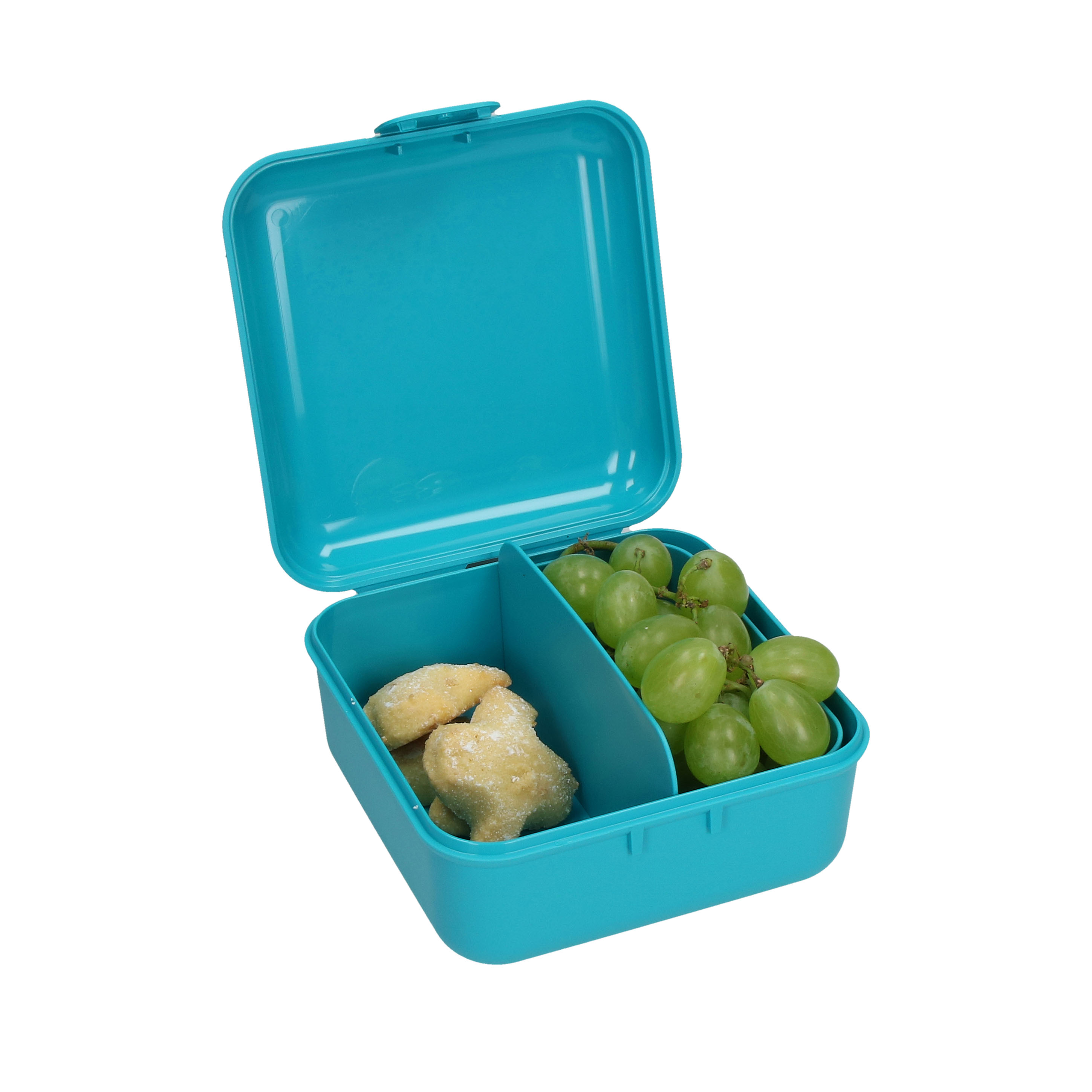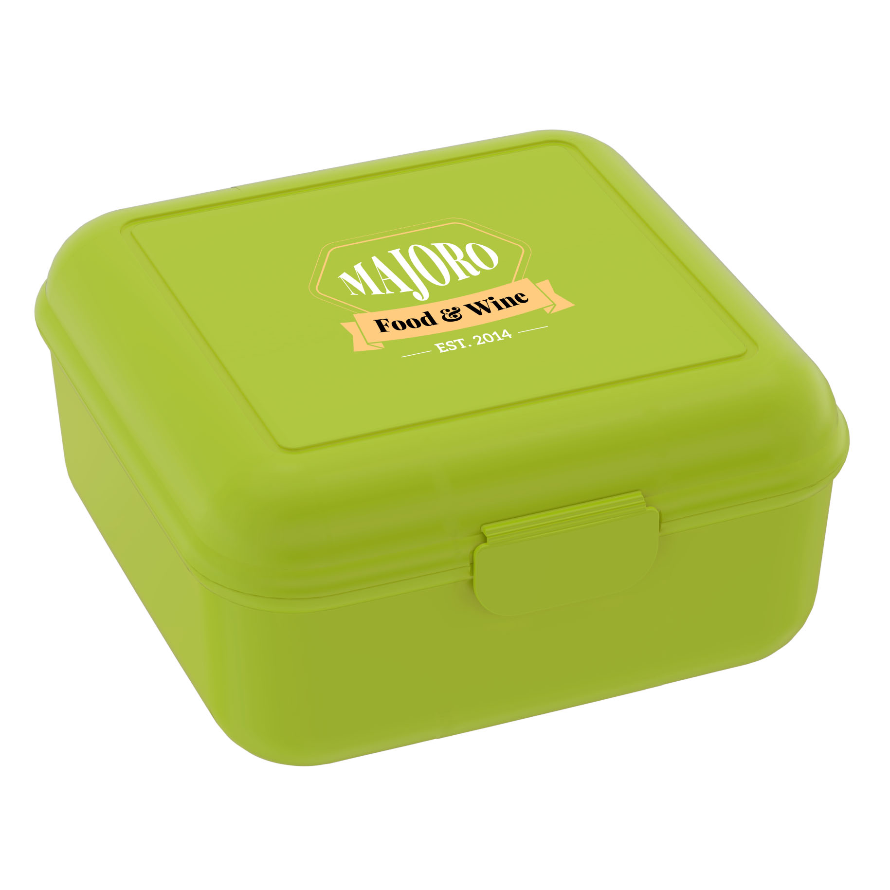 Kompakte Brotzeitbox in quadratischem Format mit einem Klickverschluss. Aufgrund der Form und der großzügigen Höhe ideal für Brötchen und Sandwiches. IMould-Veredelung möglich.