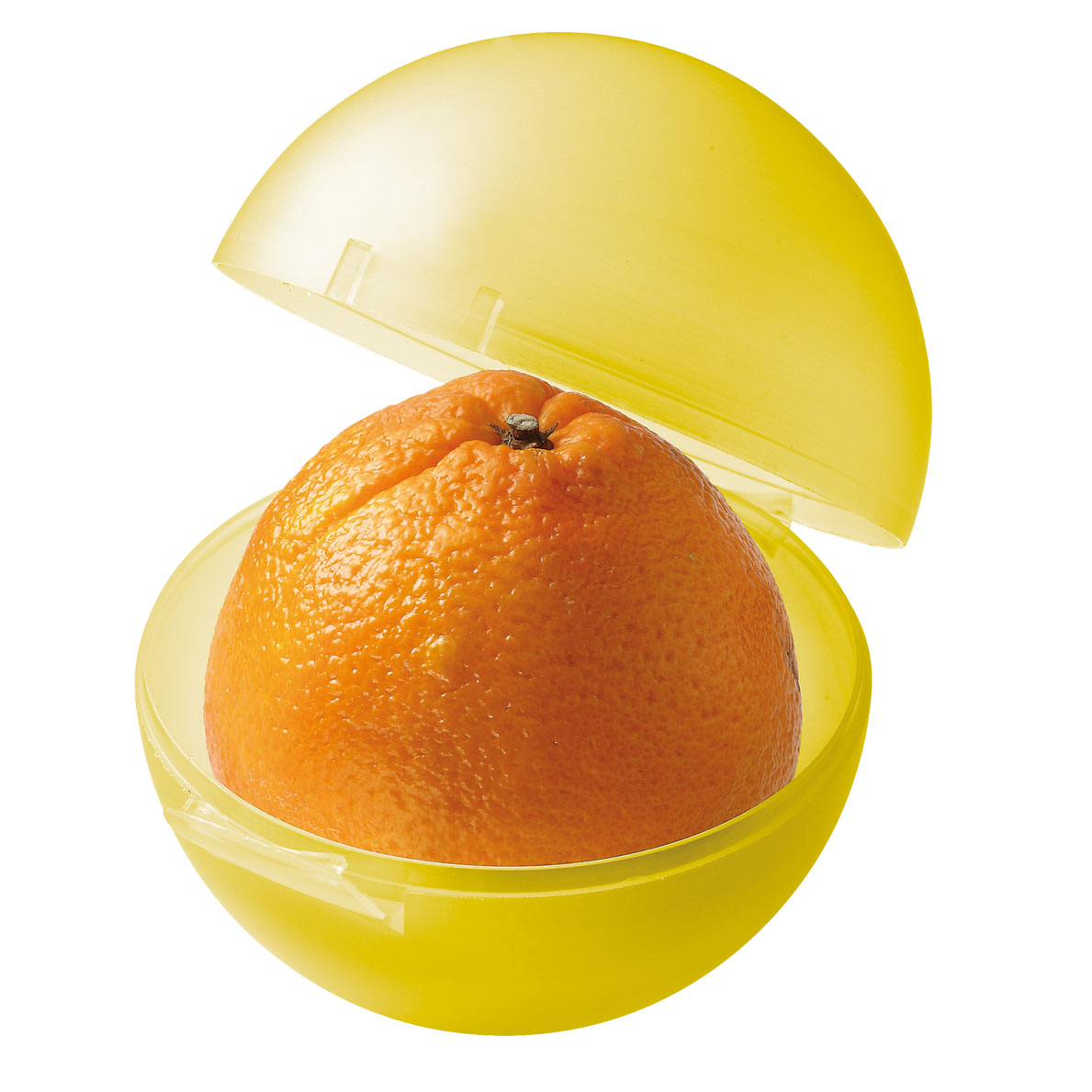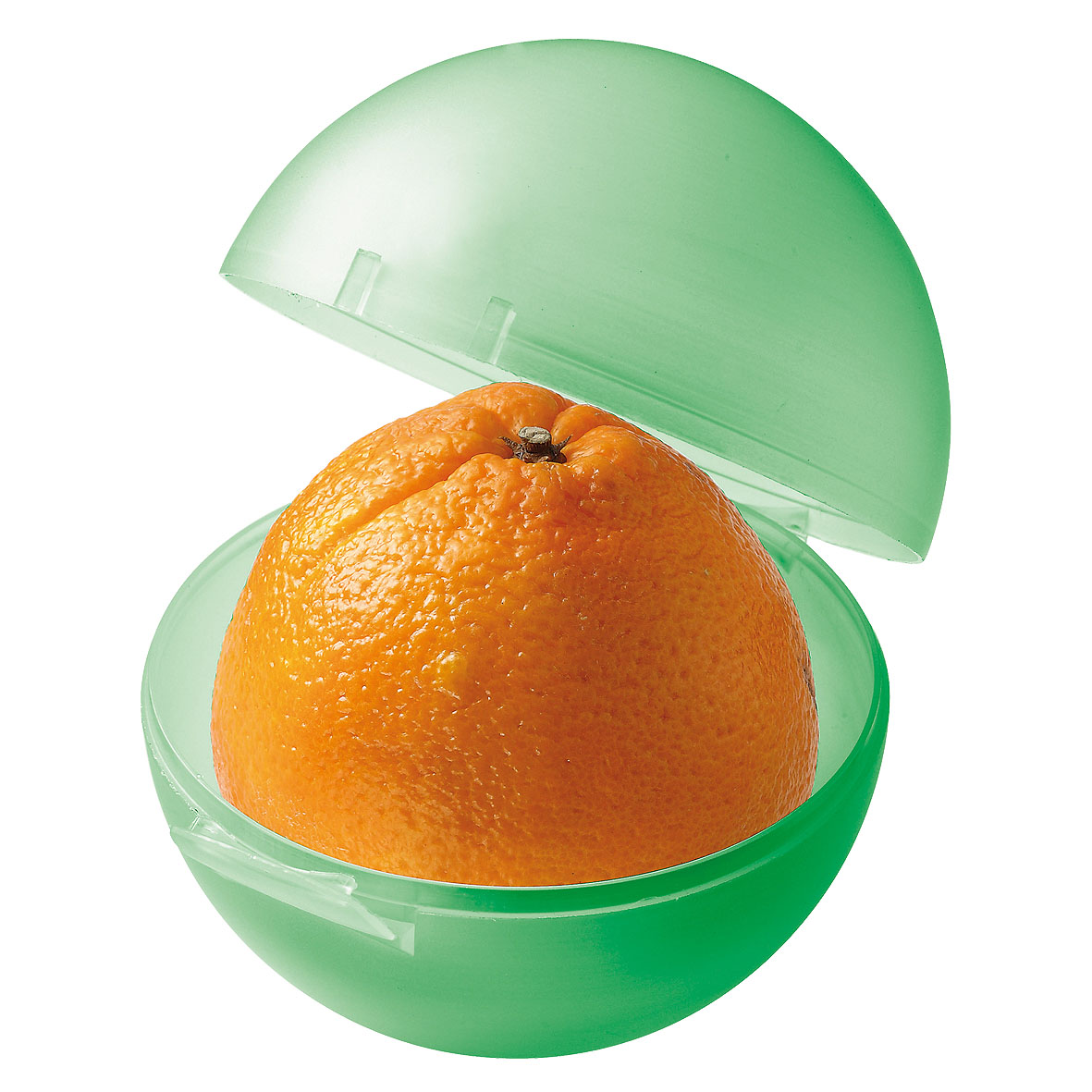 Runde Box mit Klickverschluss und passend für eine Orange. Verhindert Druckstellen und Beschädigungen der Schale.