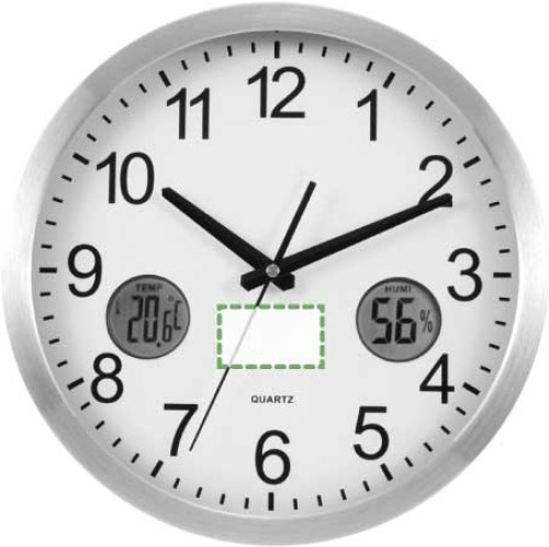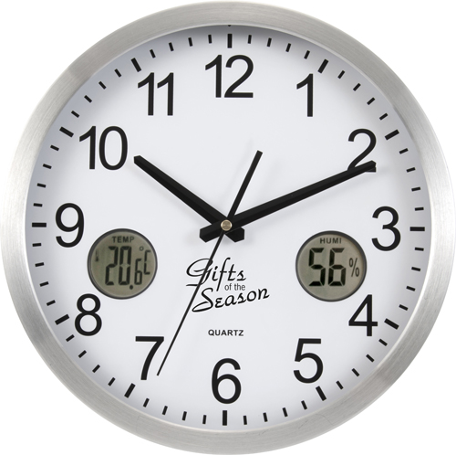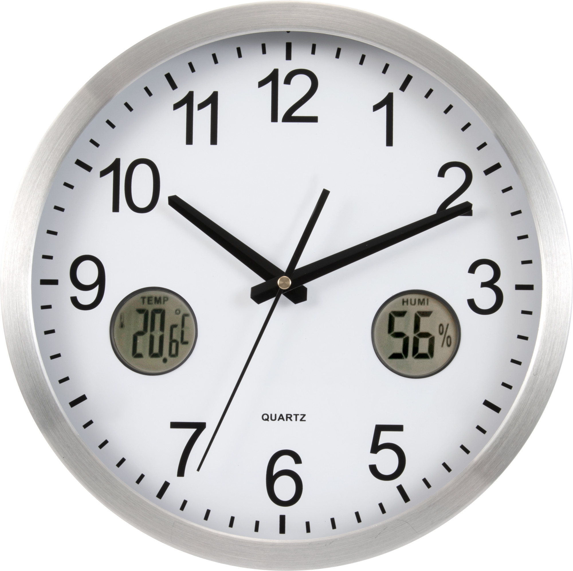 Wanduhr aus Metall mit Glasscheibe, mit Temperaturanzeige, Anbringung an der Wand oder zum Aufstellen geeignet.