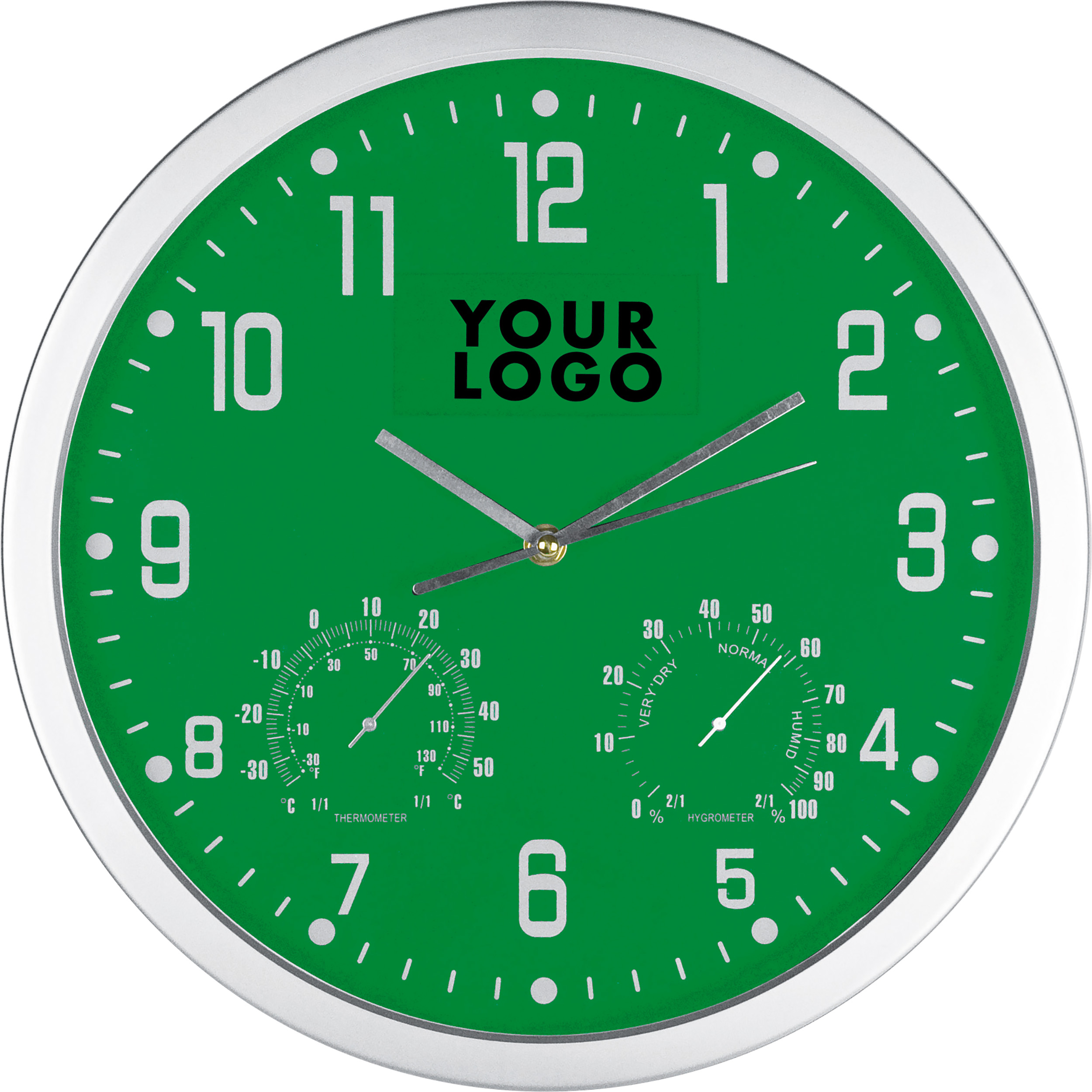 Schick und schlicht - somit ideal für Ihre Werbung ist diese Wanduhr mit Hygrometer und Thermometer. Ihre Werbung wird auf dem Werbeplättchen unterhalb der Zwölf angebracht.
