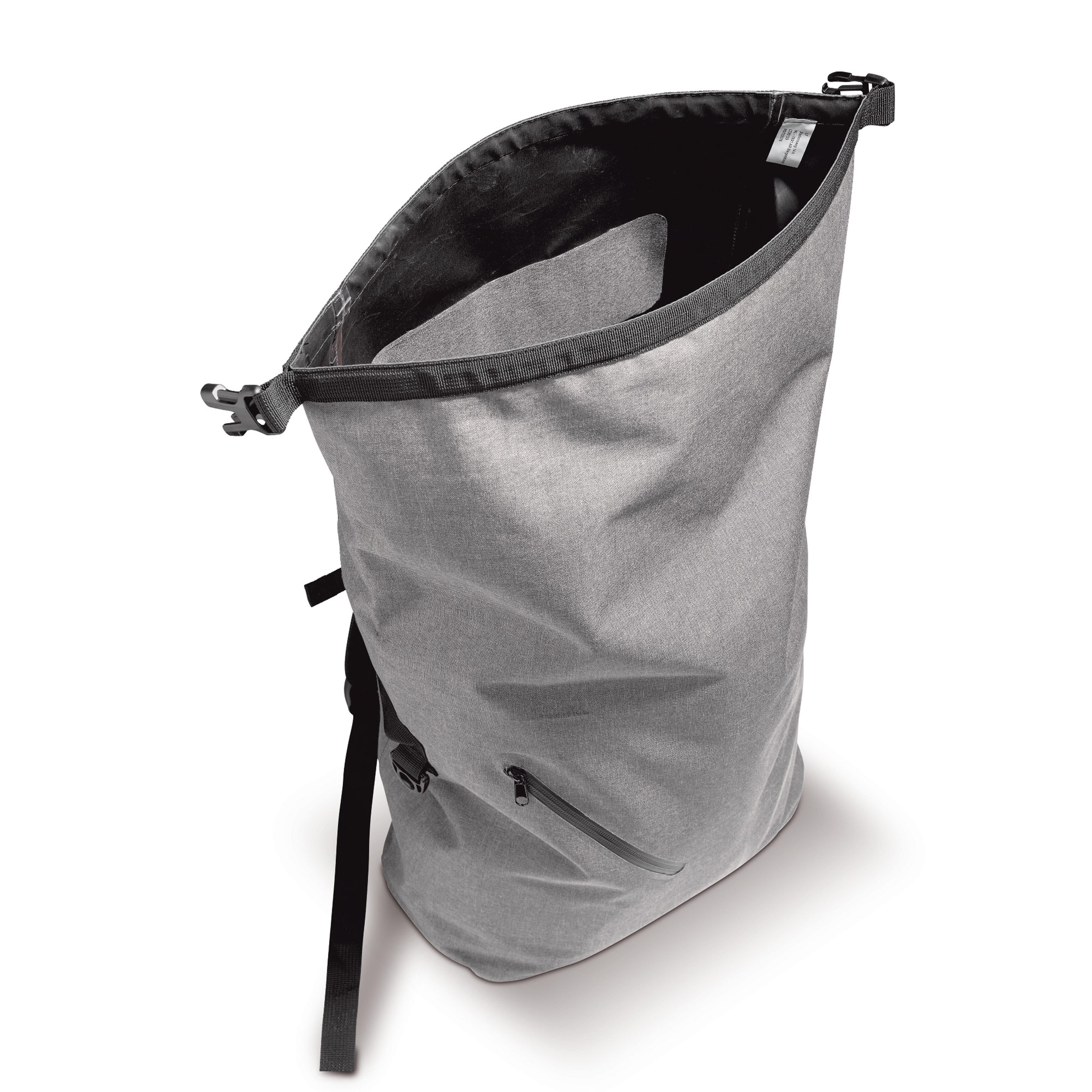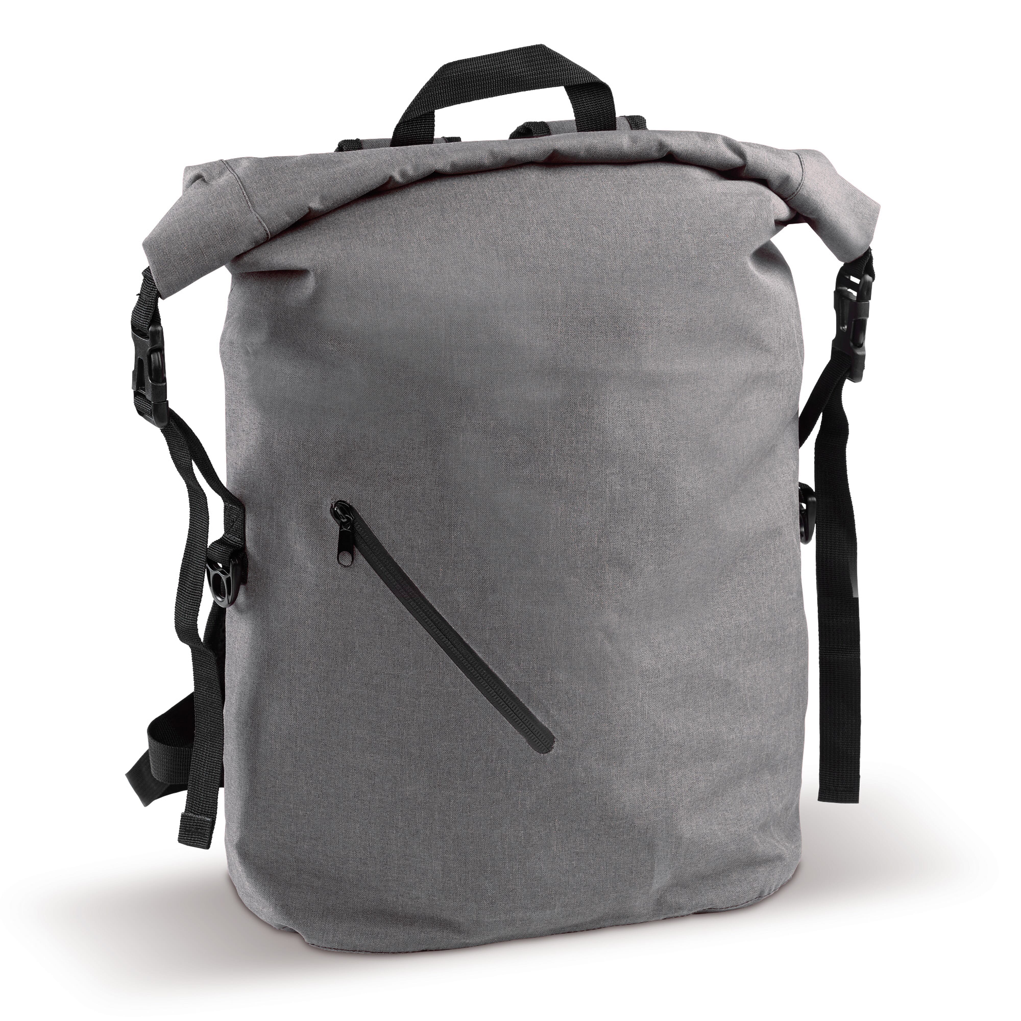 Rolltop-Rucksack mit Klettverschluss aus 390 g/m² (recycelte Baumwolle 80% und recycelter Polyester 20%). Fronttasche mit Reißverschluss.