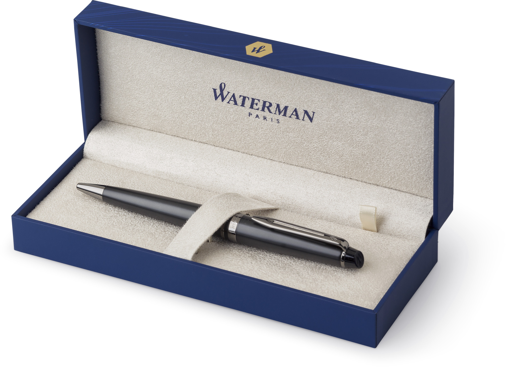 Waterman Expert Metallkugelschreiber mit Ruthenium-Besatz. Schreibfarbe blau. Verpackt in einer Geschenkbox.