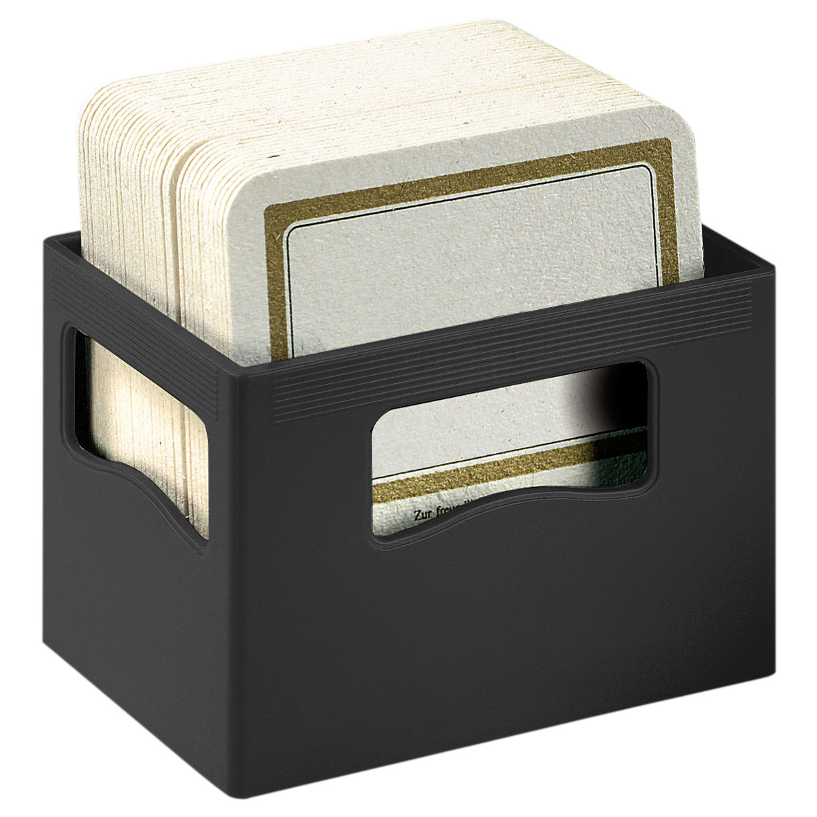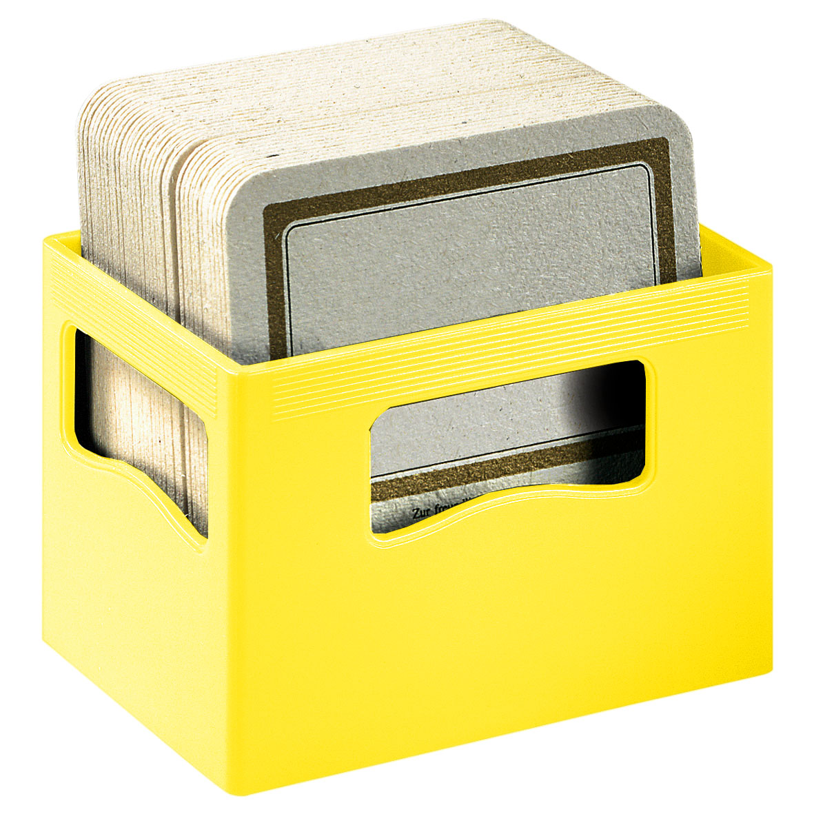 Set mit 10 Untersetzern aus RPET-Filz in einem Halter aus Bambus. Bambus ist ein natürliches Produkt, es kann daher zu leichten Abweichungen in Farbe, Dekor und Maßen kommen.