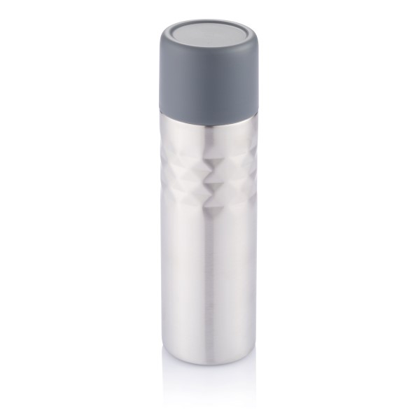 Doppelwandige Thermoflasche aus rostfreiem Edelstahl mit Schraubverschluss, der sich auch als Trinkbecher eignet, und praktischem Drück-Schütt-Mechanismus. Mit auffälligem 3D Design auf der Grifffläche. Auslaufsicher. Fassungsvermögen 500 ml. Wird einzeln in einem Kraftkarton geliefert.