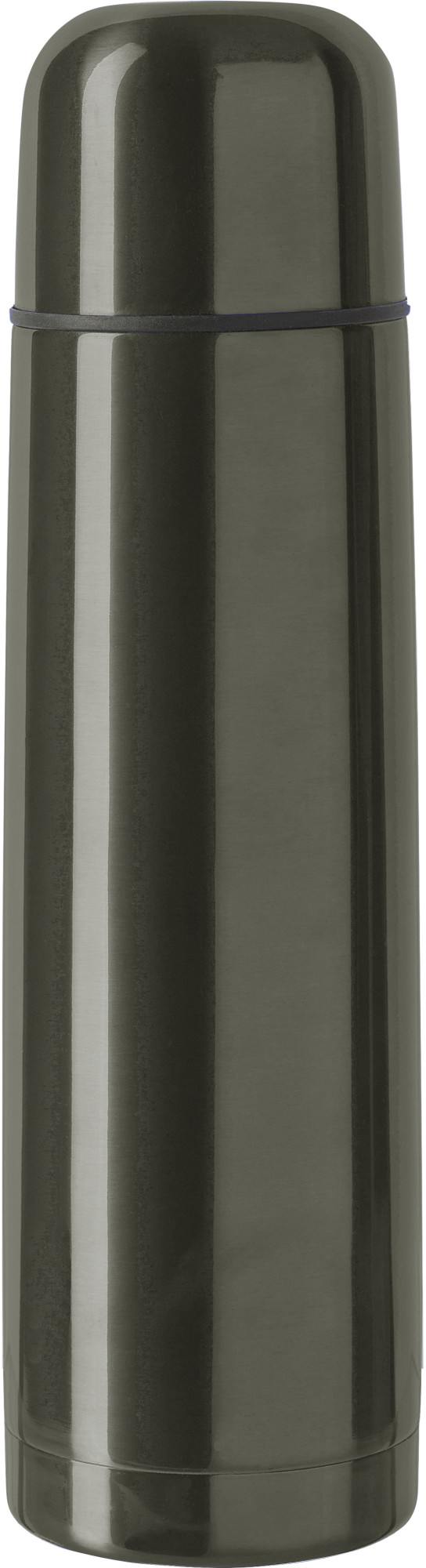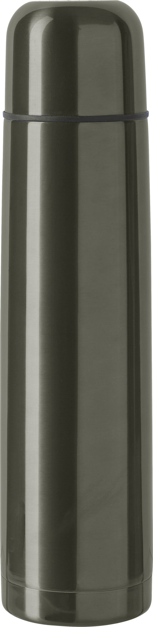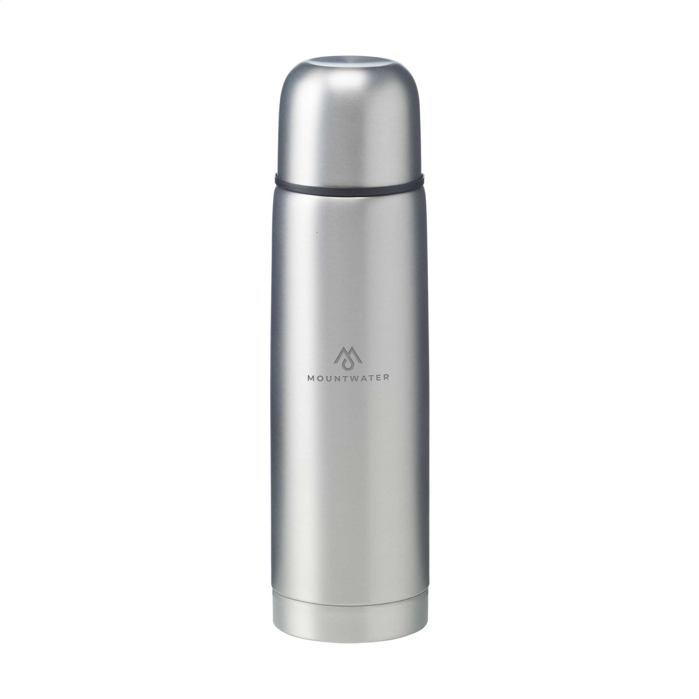 Doppelwandige Isolierflasche mit Becher im Deckel. Ausgießer mit Einhand-Druckknopf, der sich automatisch schließt, wenn der Deckel auf die Flasche geschraubt wird. Volumen 750 ml.