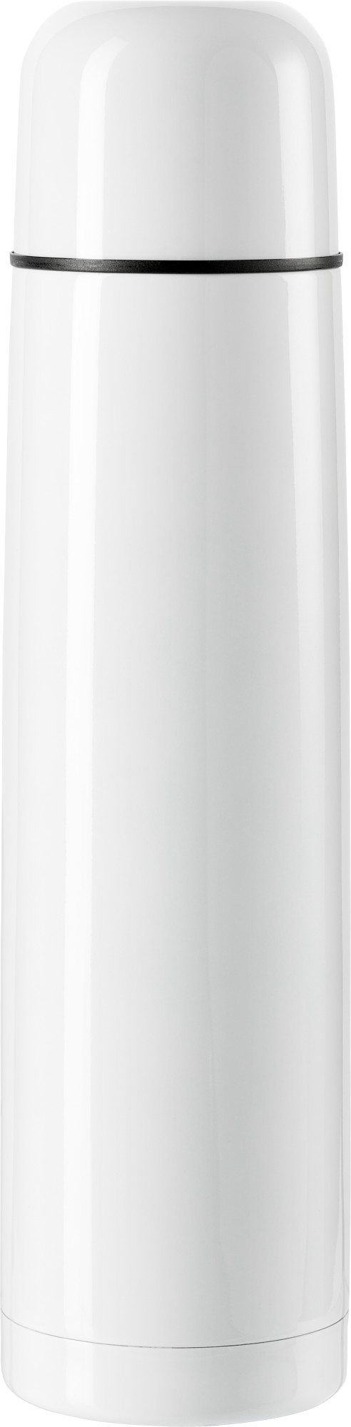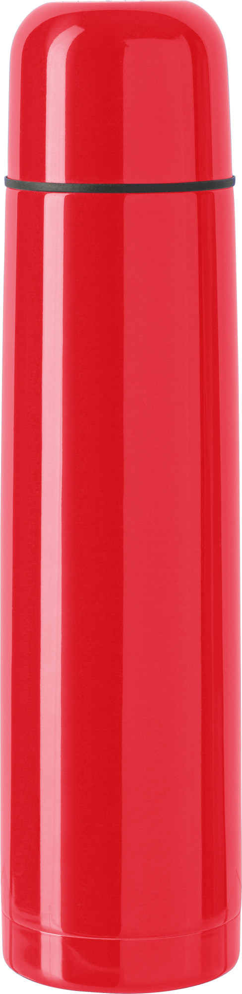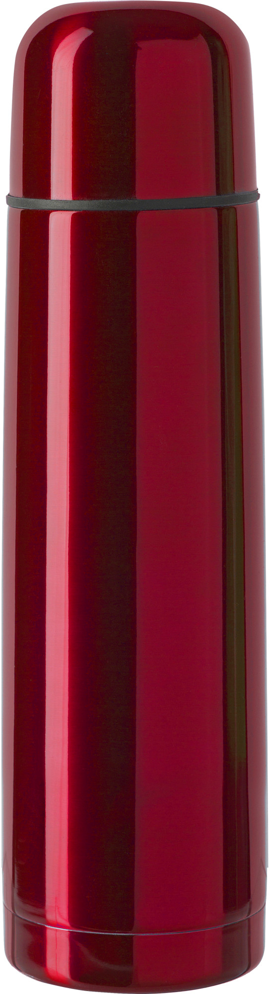 Doppelwandige Isolierflasche mit Becher im Deckel. Ausgießer mit Einhand-Druckknopf, der sich automatisch schließt, wenn der Deckel auf die Flasche geschraubt wird. Volumen 750 ml.