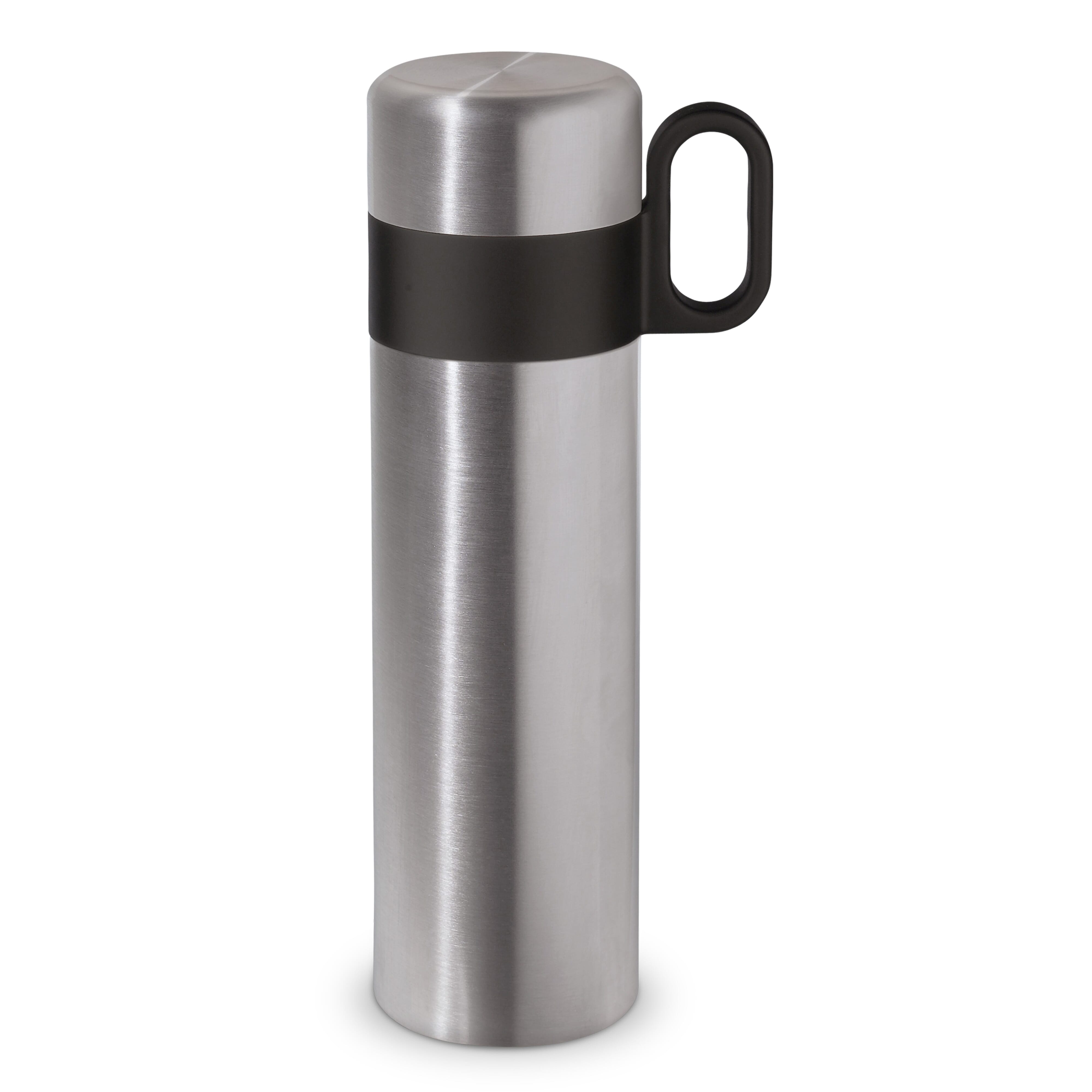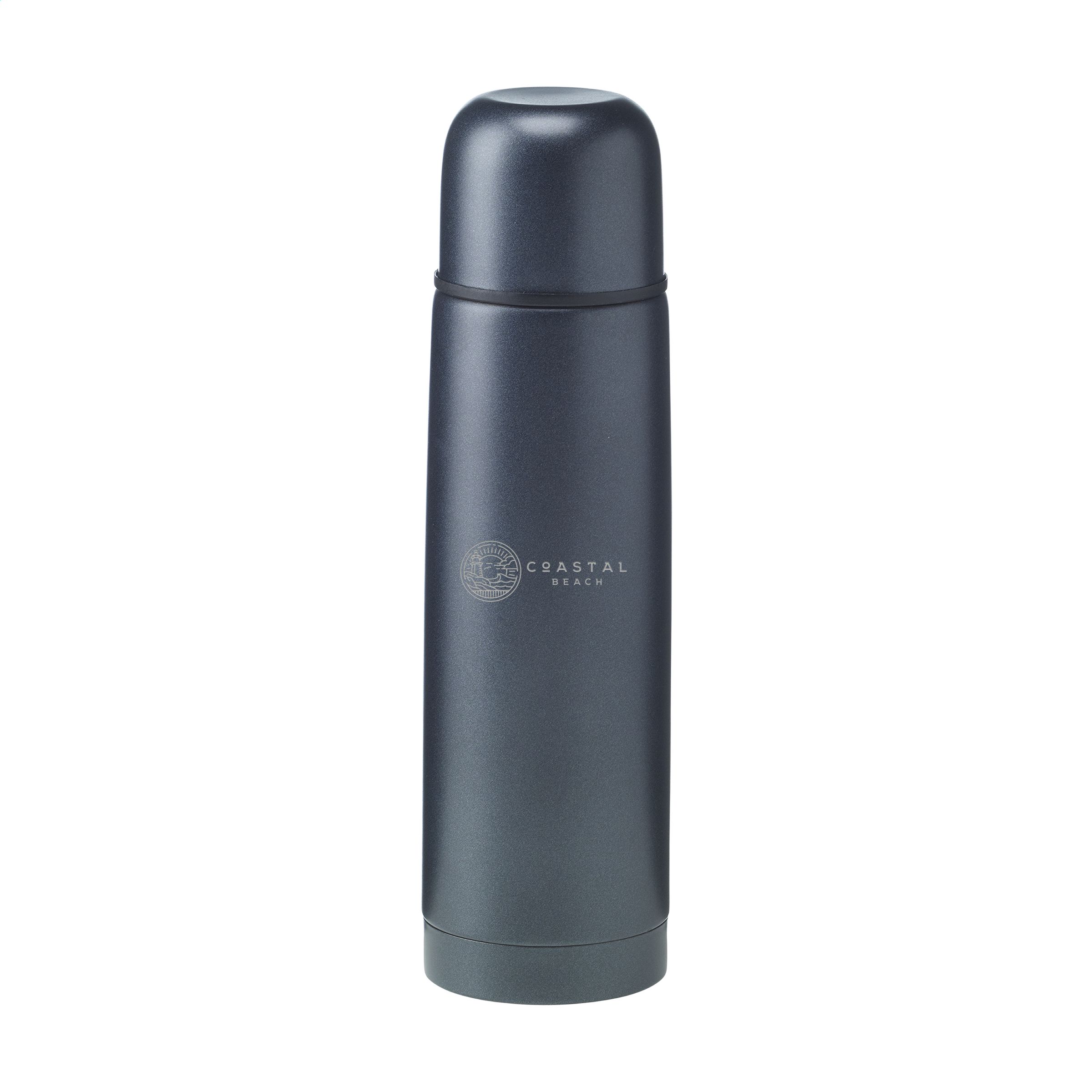 Vakuumisolierte Edelstahl-Thermoflasche mit Schraubverschluss/Trinkbecher und handlichem Schanksystem mit Druckverschluss. Auslaufsicher. Fassungsvermögen 500 ml. Wird einzeln in einem Kraftkarton geliefert.