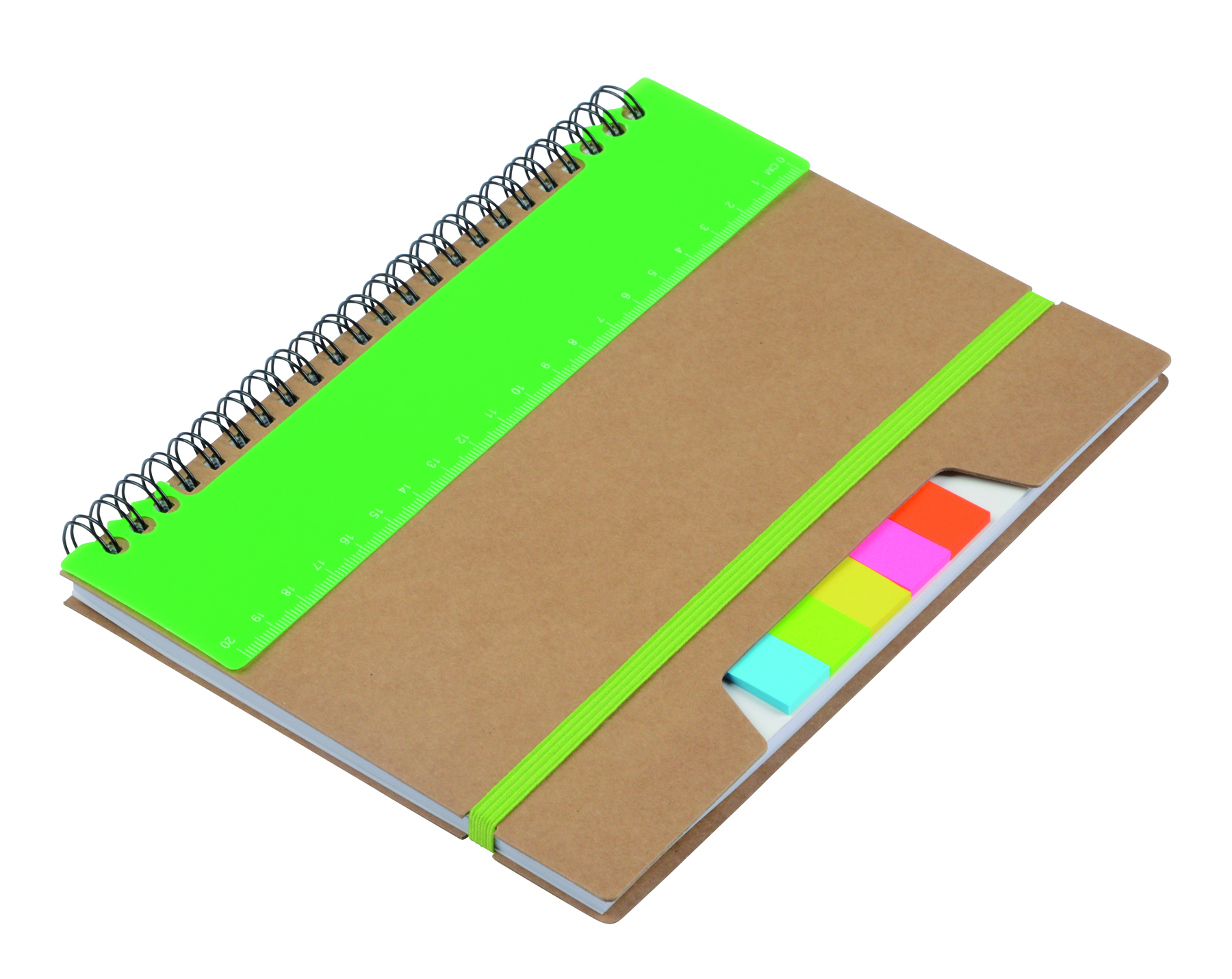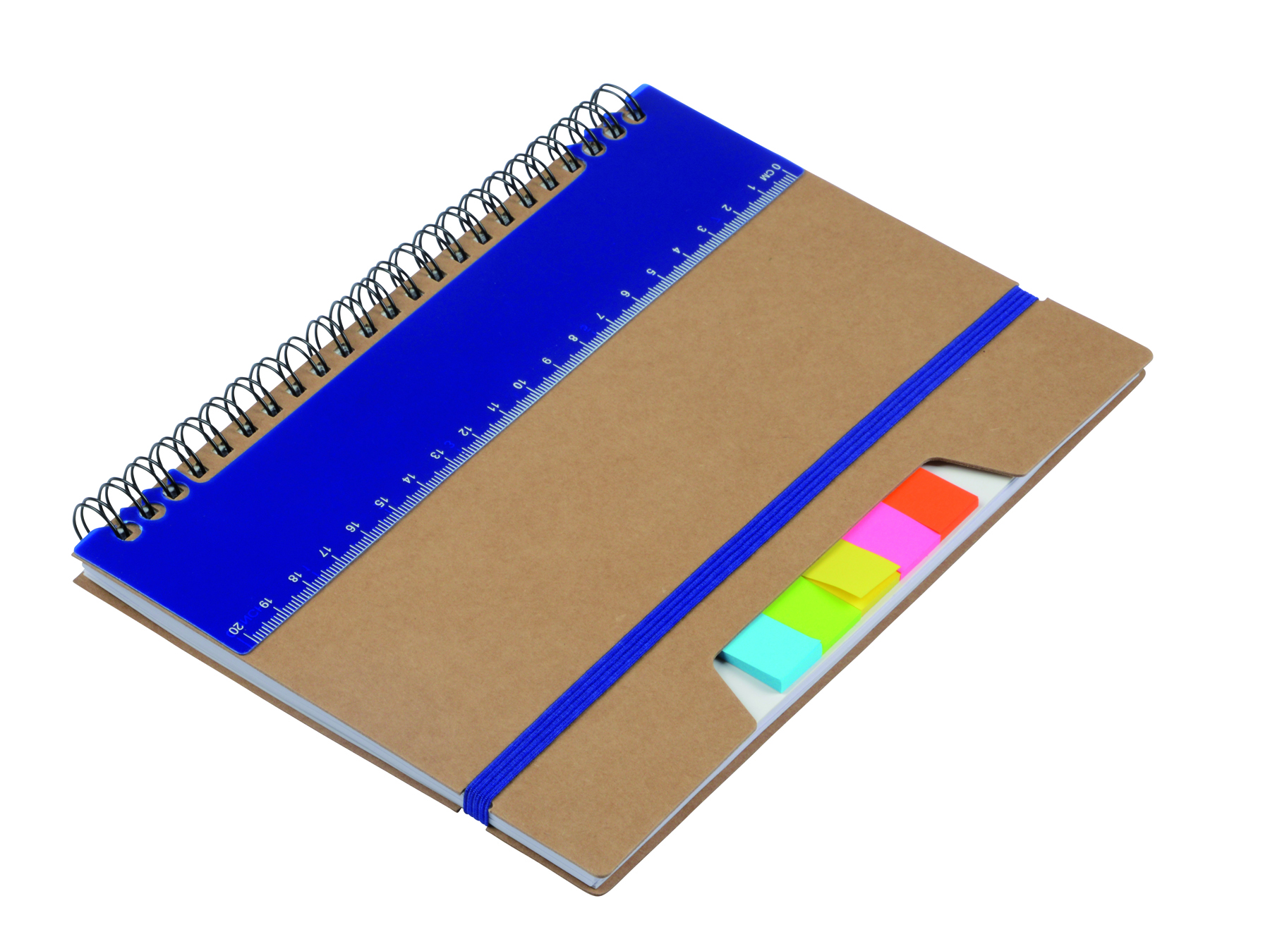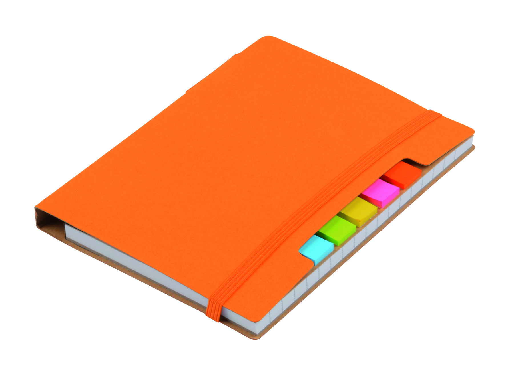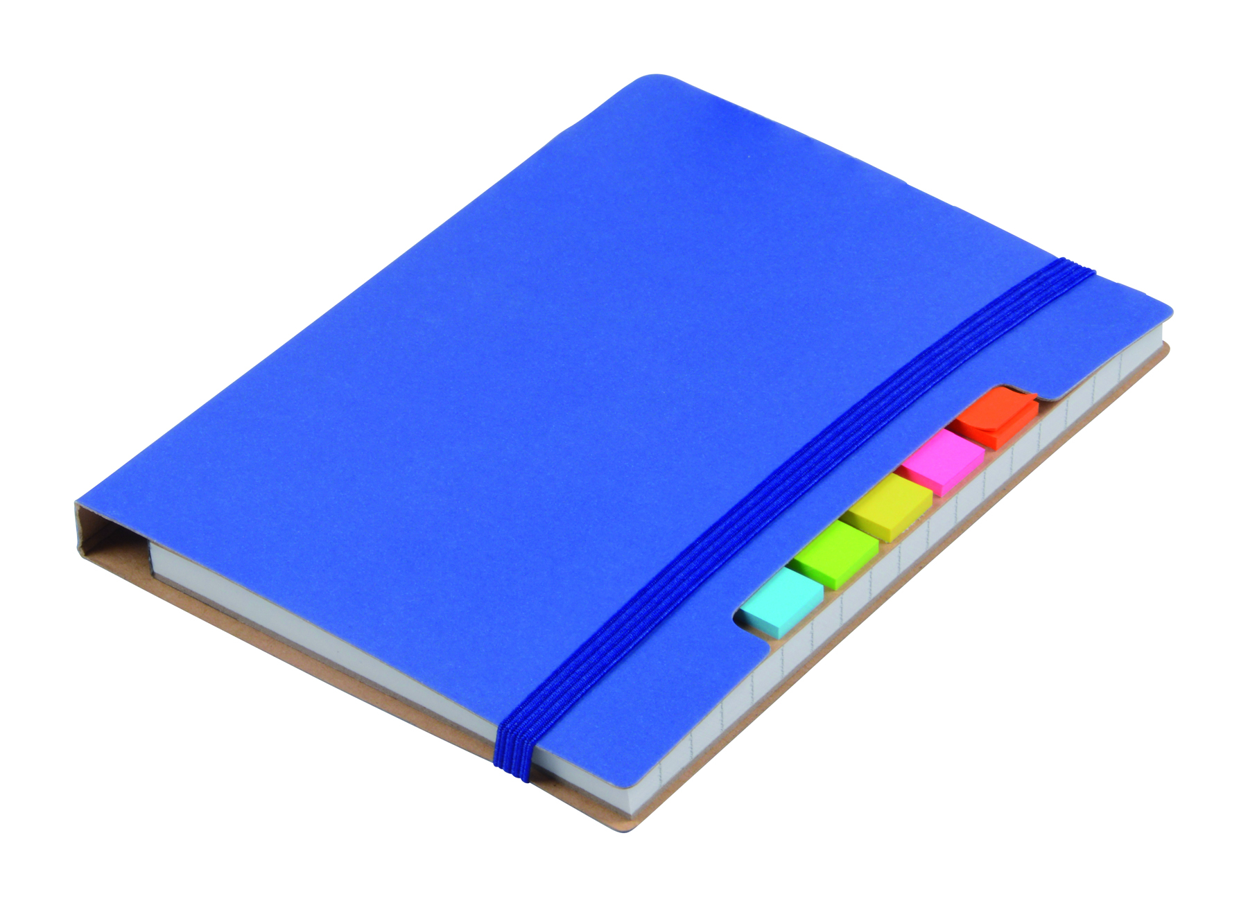 Notizbuch mit Cover aus recyceltem Karton. 100 Blatt Blanko-Recyclingpapier, 2 unterschiedlich große, gelbe Haftnotizblöcke und 5 farbige Markerblöcke. Mit passendem Druckkugelschreiber mit Schaft aus Papier. Stifthalter. Elastisches Verschlussband.