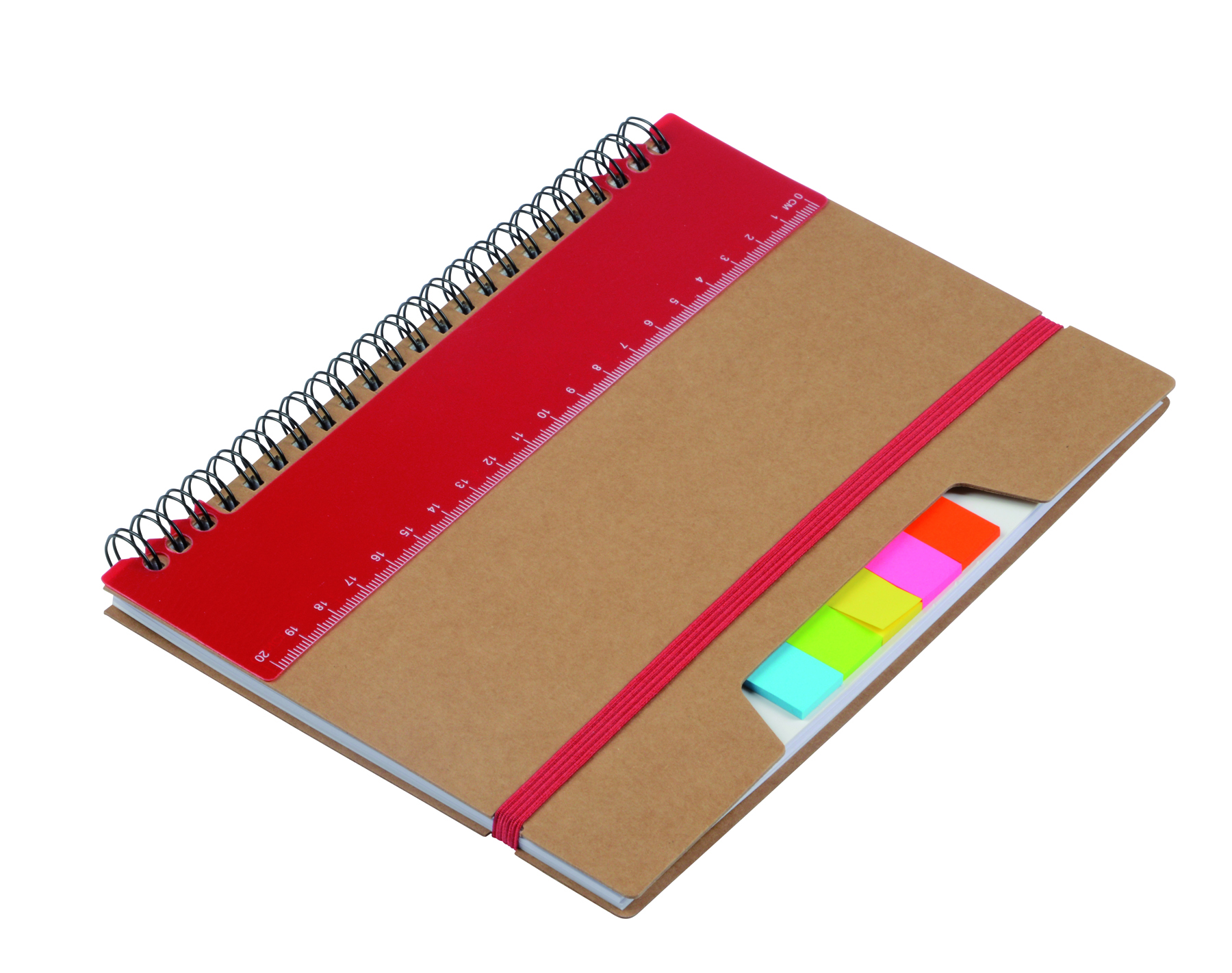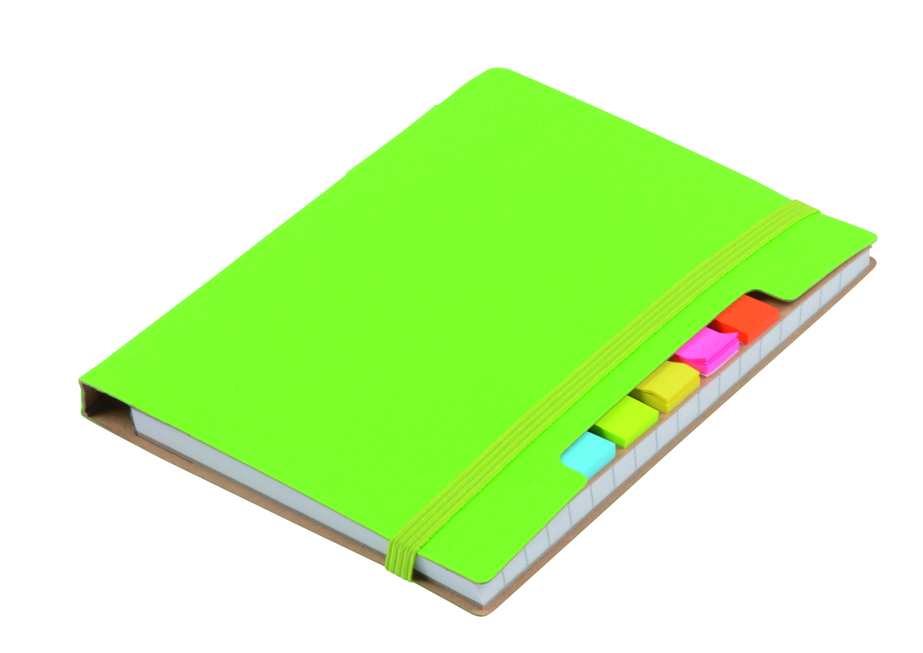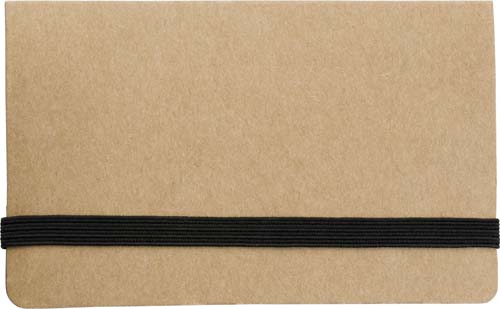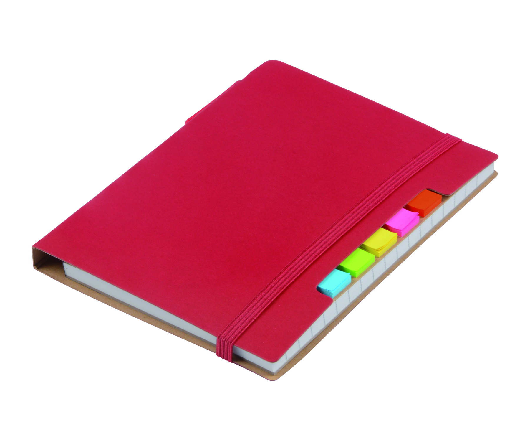 Notizbuch mit Cover aus recyceltem Karton. 100 Blatt Blanko-Recyclingpapier, 2 unterschiedlich große, gelbe Haftnotizblöcke und 5 farbige Markerblöcke. Mit passendem Druckkugelschreiber mit Schaft aus Papier. Stifthalter. Elastisches Verschlussband.