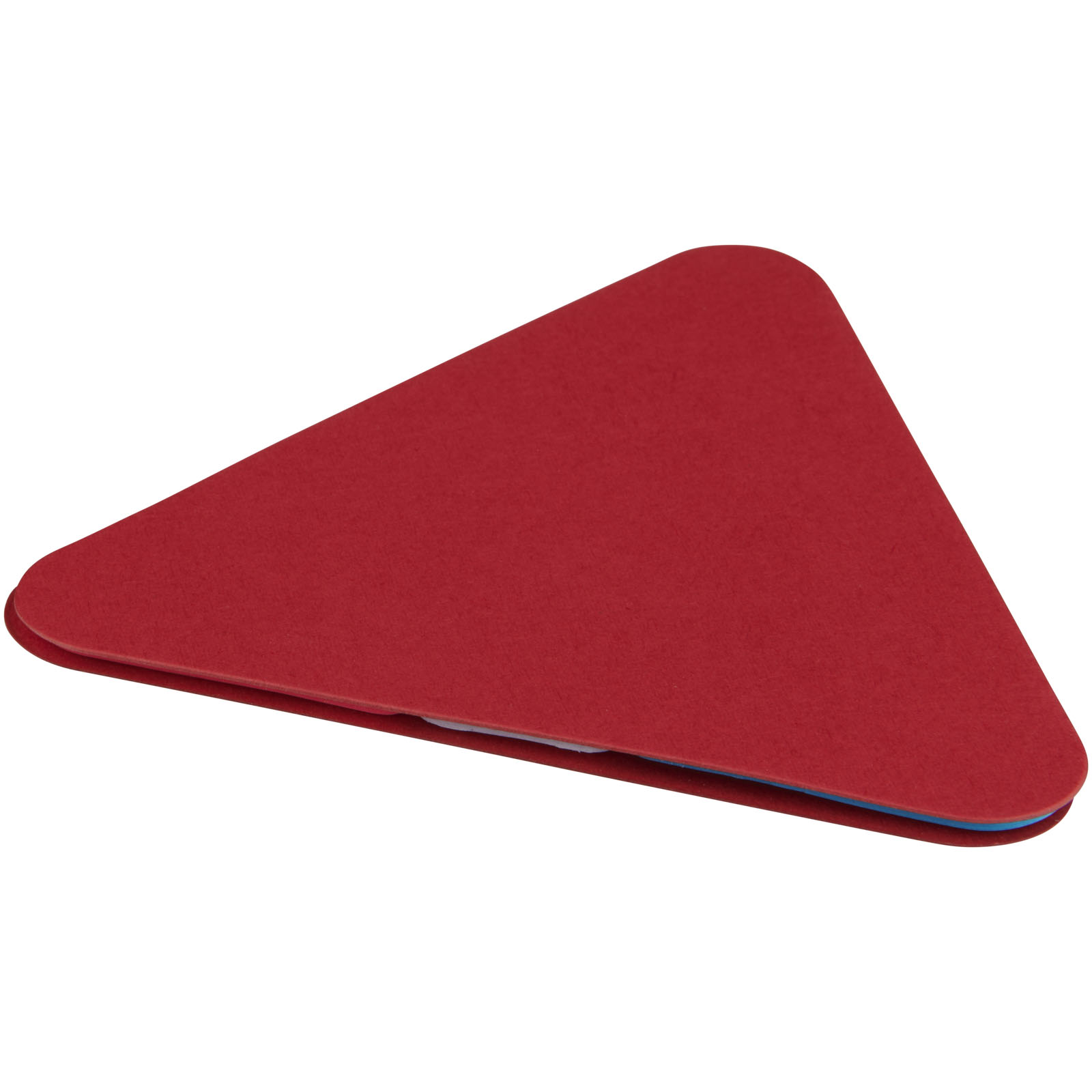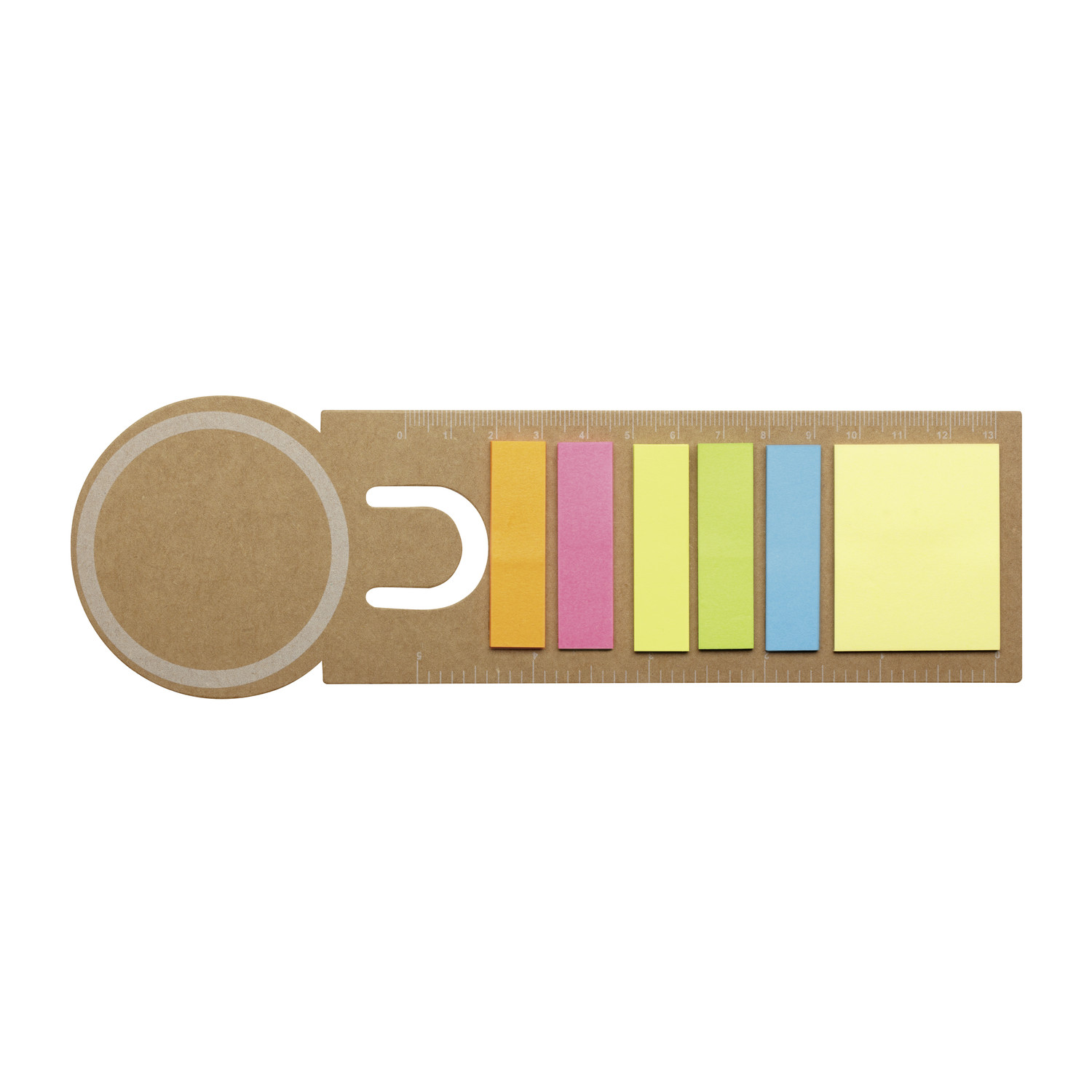 Spender für Haftnotizen aus recyceltem Karton mit passendem Druckkugelschreiber. Blaue Tinte. Inkl. Haftnotizen aus Recyclingpapier in Gelb und Rosa, 5 farbigen Markerblöcken und einem transparenten 12 cm Lineal.