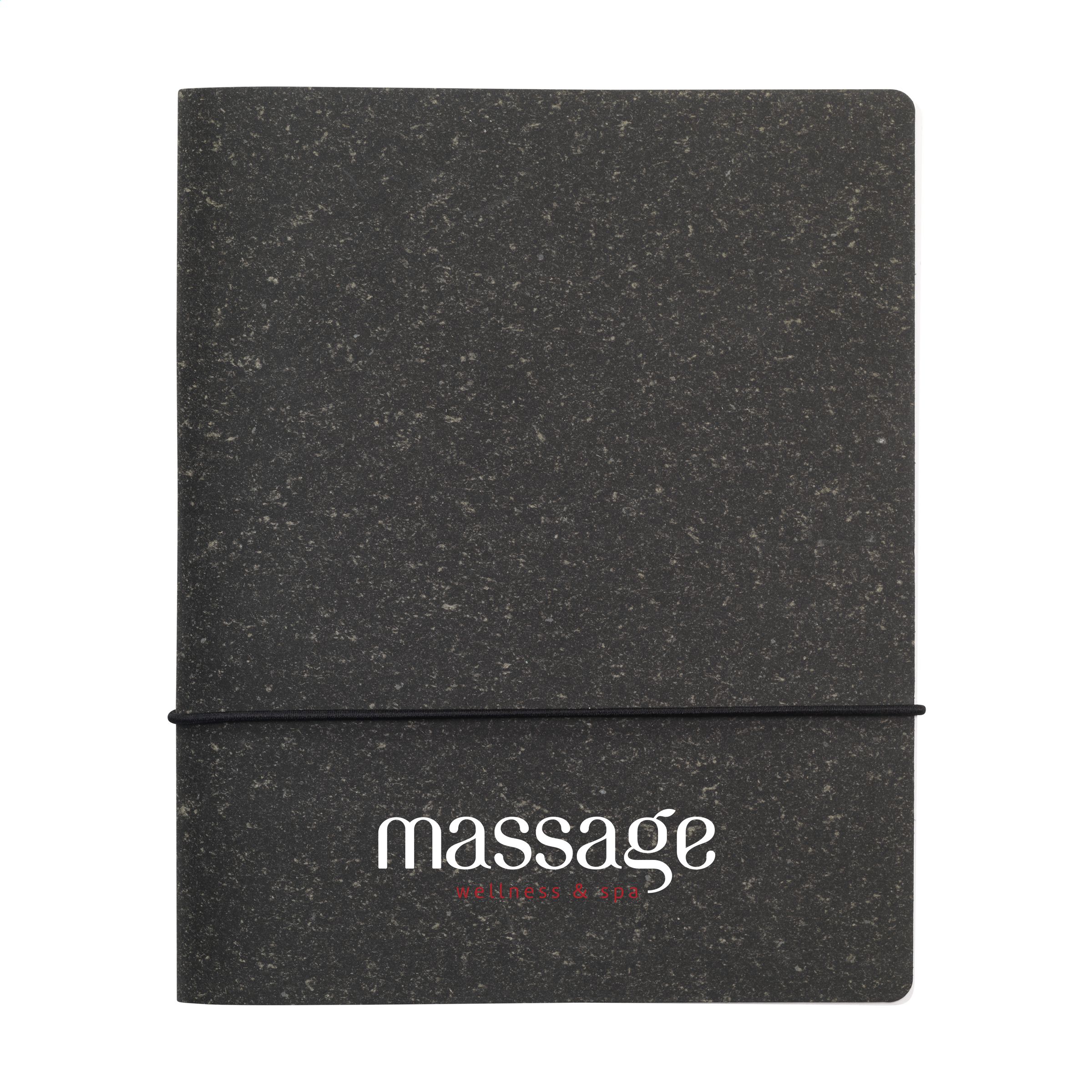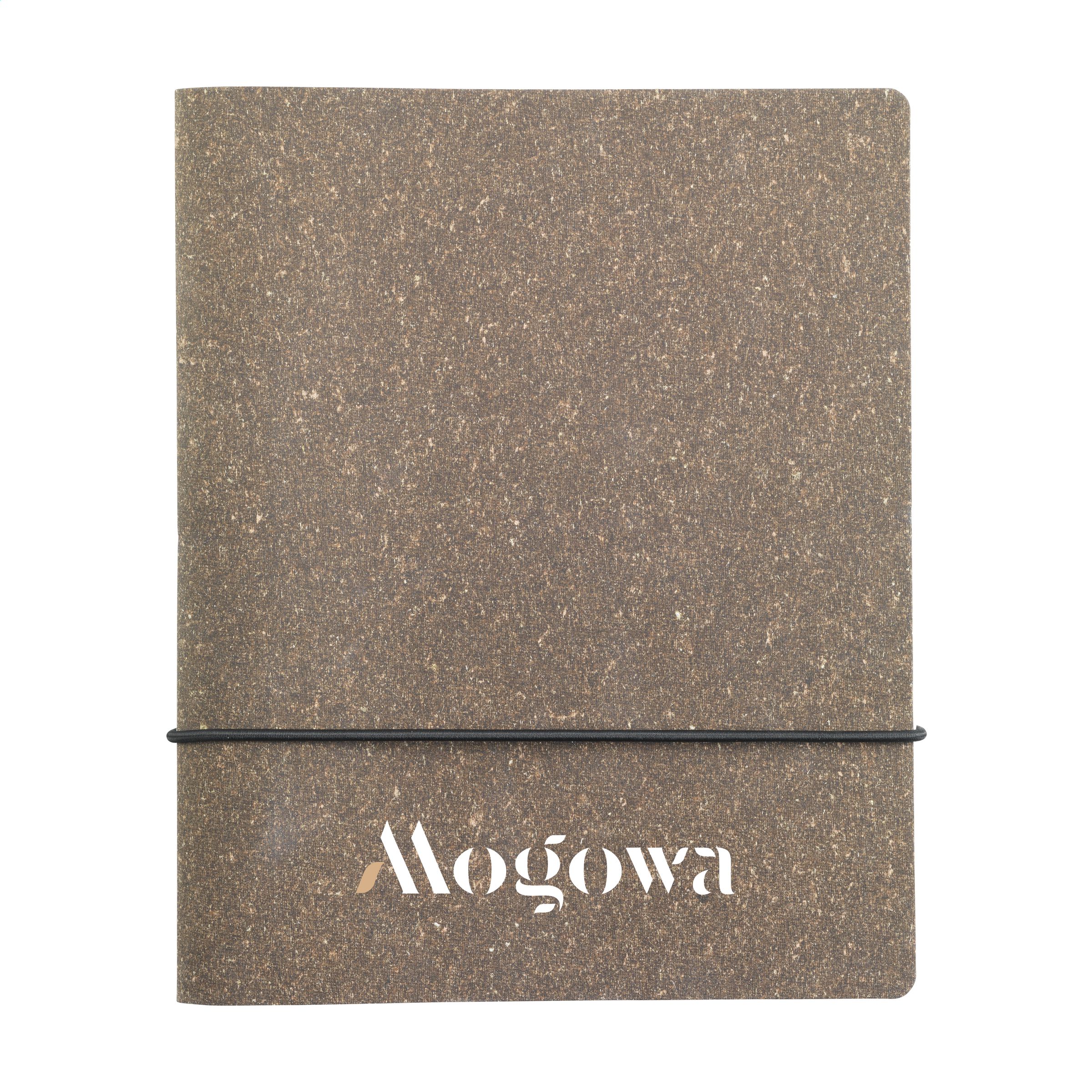 DIN A5 Notizbuch mit Hardcover aus 70% recyceltem Pre-Consumer-Leder und 30% PU-Latex. 96 Blatt (192 Seiten) liniertes Recyclingpapier. Mit farblich passendem elastischen Baumwoll Verschlussband und Stiftschlaufe.