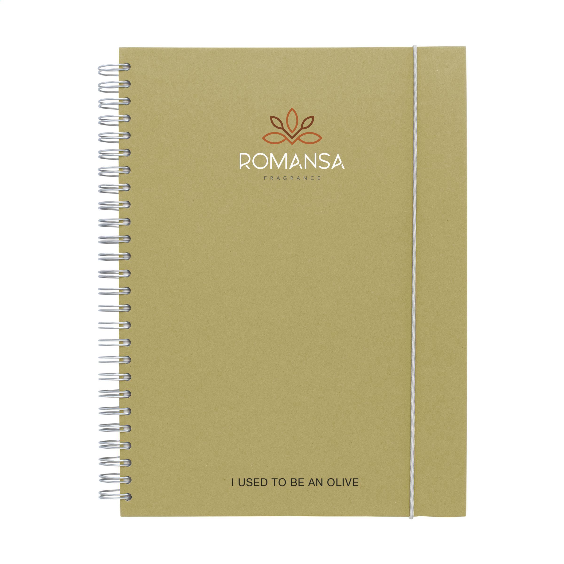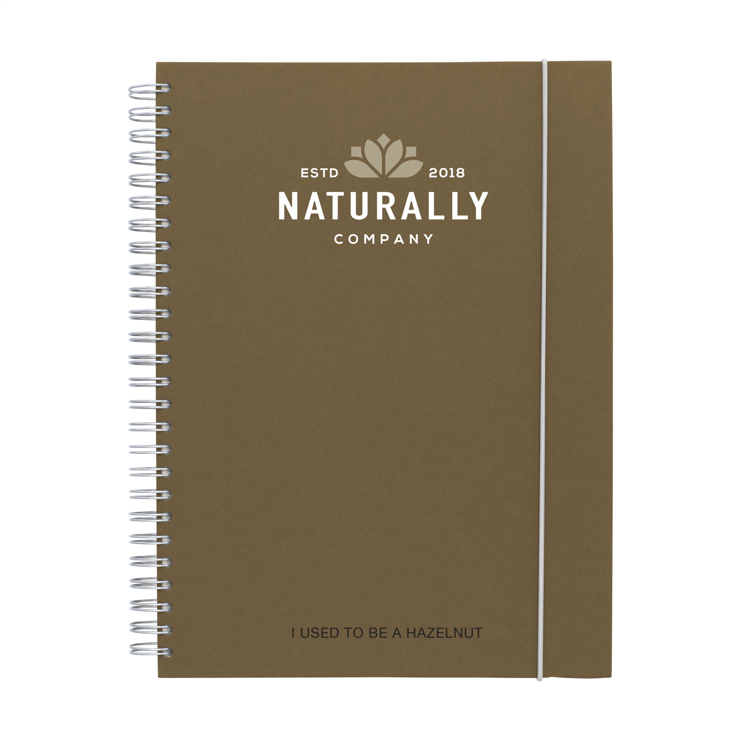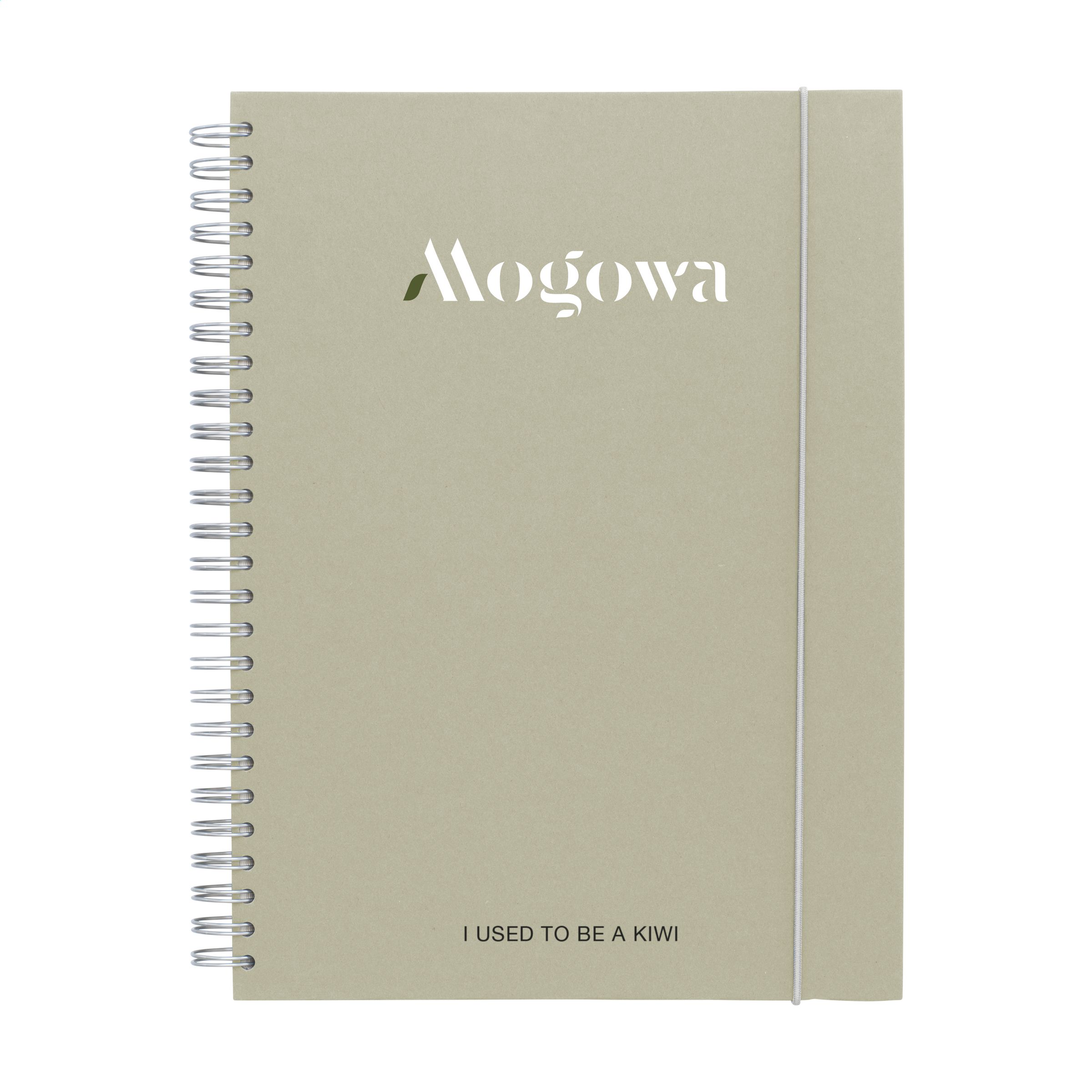 WoW! Notizbuch im A5-Format. Mit 100 Blatt/200 Seiten liniertem Papier (80 g/m²), einer stabilen Wire-O-Bindung und einem Verschlussgummi. Der Hardcover-Einband besteht aus landwirtschaftlichen und organischen Abfällen, z. B. von Tomaten, Paprika, Pflanzen und Zwiebeln. Diese Abfälle werden mit Recyclingpapier aus Europa gemischt. Ein praktisches Notizbuch, um Ideen zu notieren und festzuhalten.