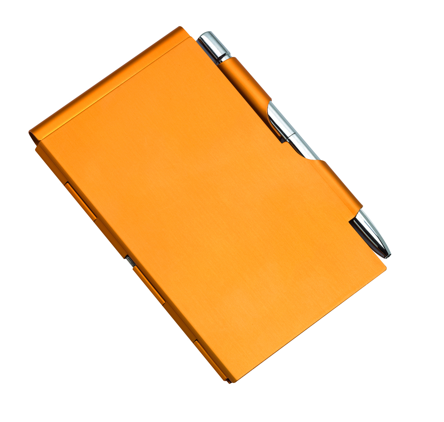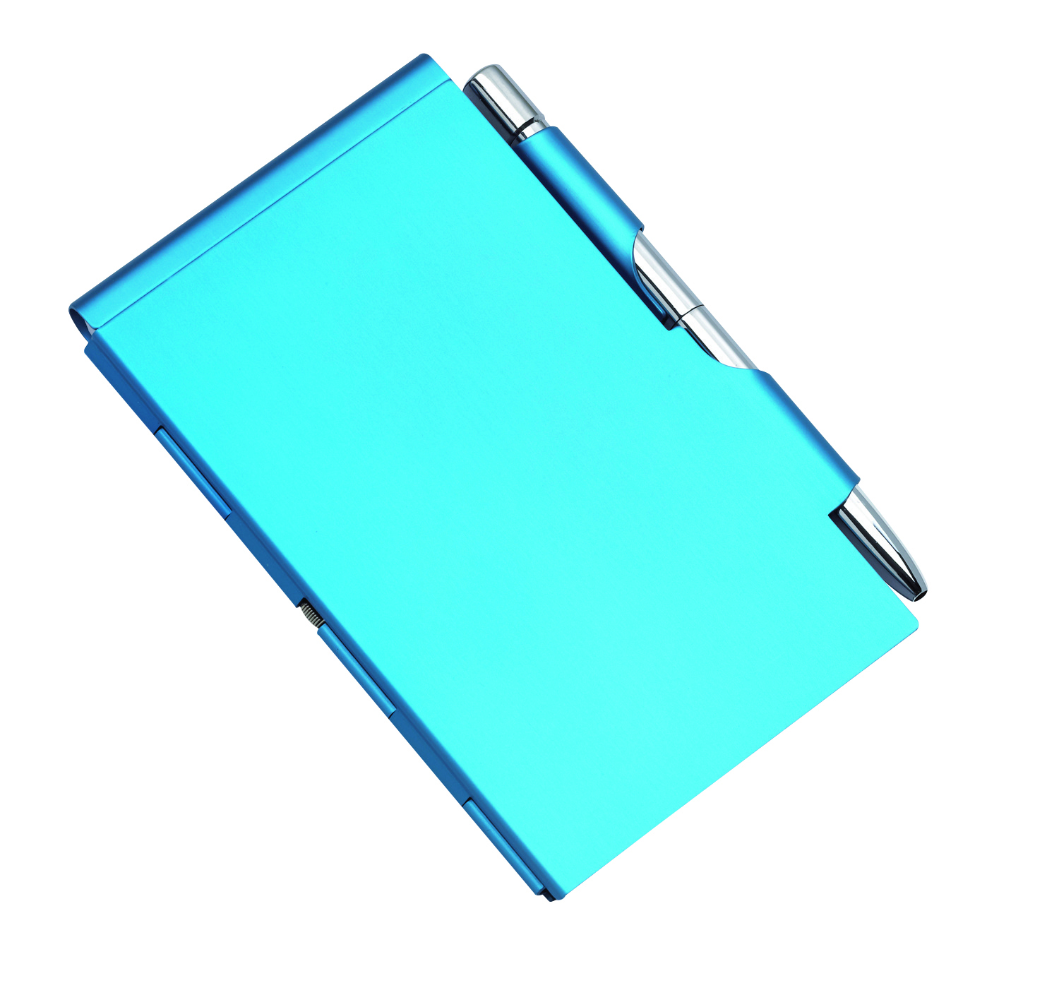 Mini-Notizblock MEMO : im praktischen Brusttaschen-Format, mit integriertem Drehkugelschreiber (schwarzschreibend) und Klemmvorrichtung zum Befestigen, aus hochglanzpoliertem Aluminium