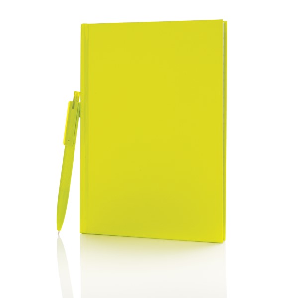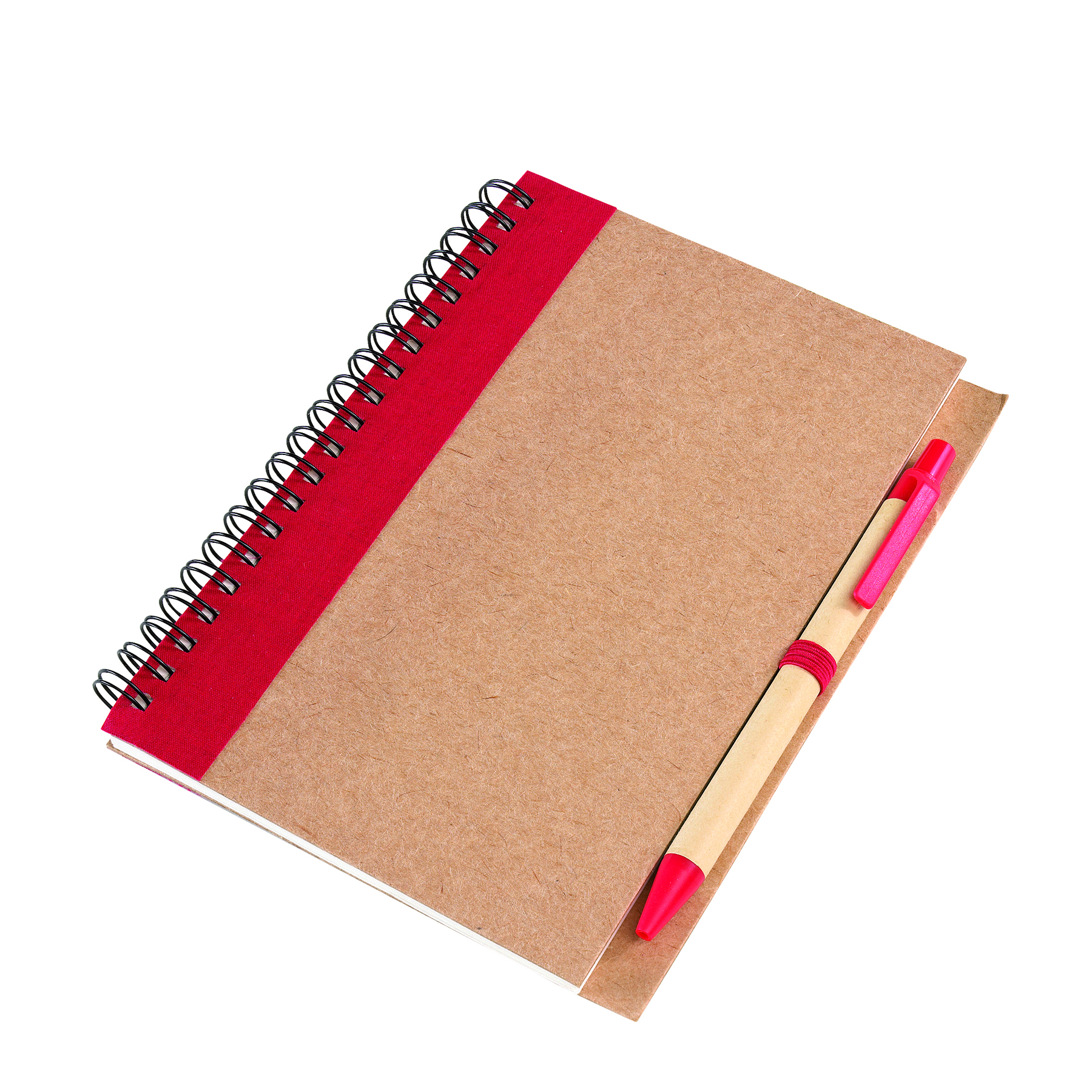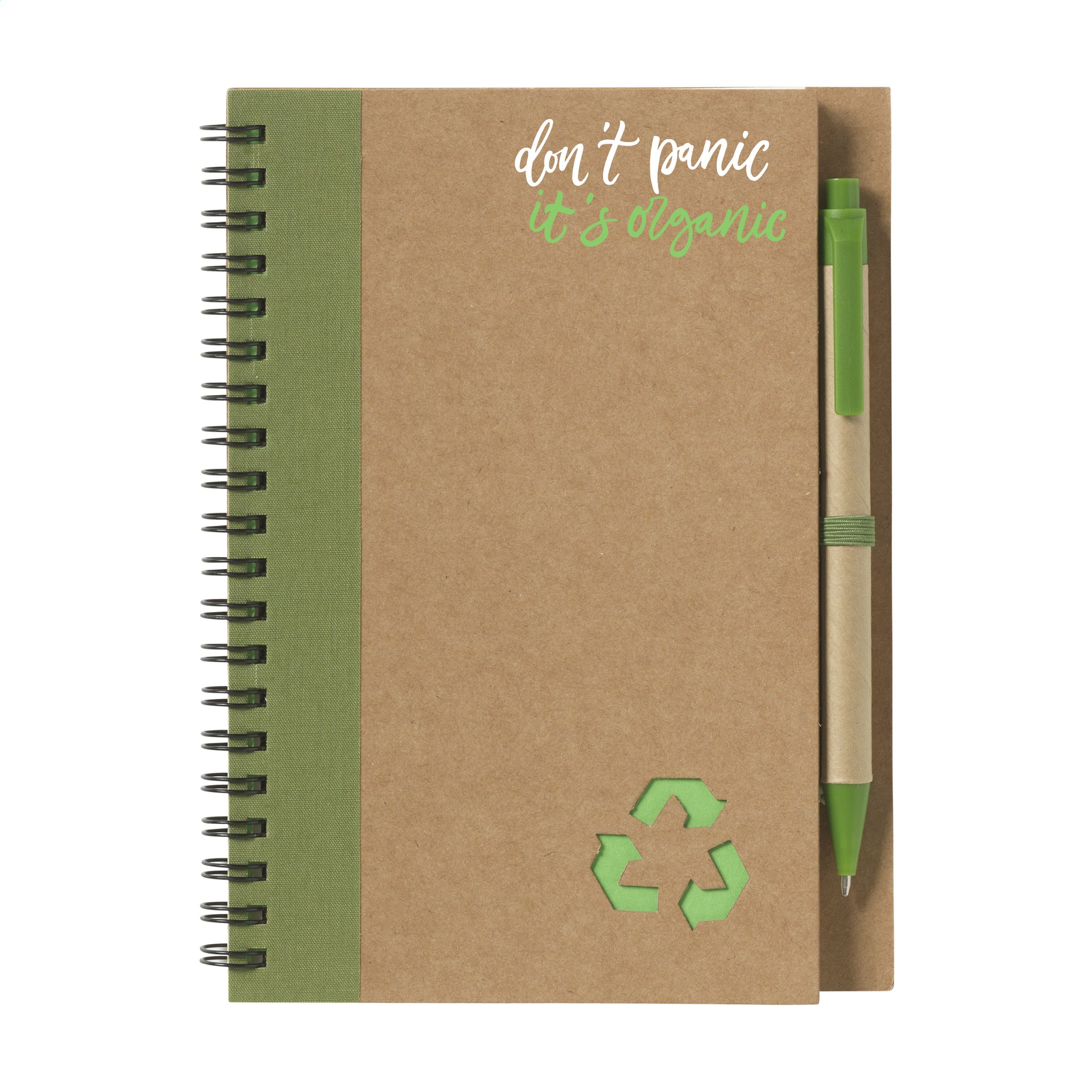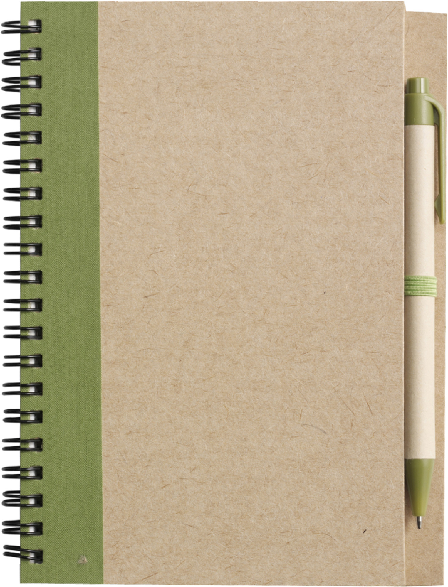 Notizbuch aus recyceltem Material mit ca. 70 Blatt/140 Seiten cremefarbenem, liniertem Papier (70 g/m²), kartoniertem Umschlag. Gebunden in einer starken, metallenen Spiralbindung. Inkl. blauschreibendem Kugelschreiber.