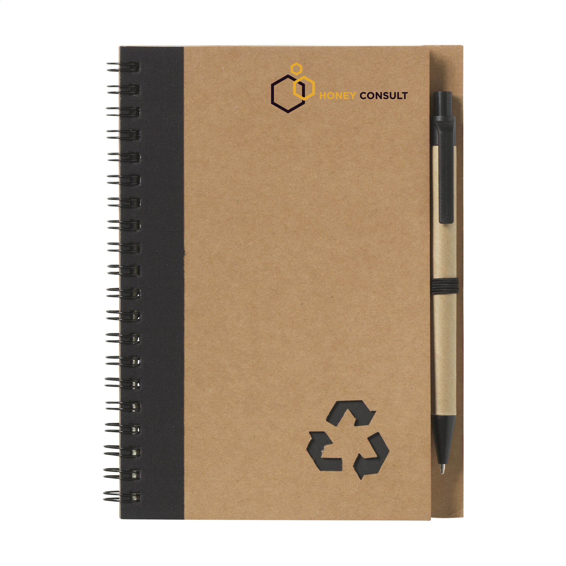 Notizringbuch RECYCLE : bestehend aus recyceltem Papier/Pappe, Kugelschreiber (schwarzschreibend) aus Kunststoff/Pappe, 70 Blätter, mit Ringlochung und Gummiband als Stiftehalter