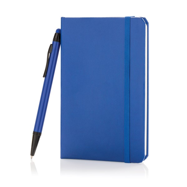 DIN A6 Notizbuch mit Hard Cover aus PU und 72 Blatt (144 Seiten) liniertem Papier. Elastisches Verschlussband und Lesebändchen. Mit passendem Druckkugelschreiber aus Metall. Blaue Tinte.