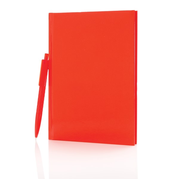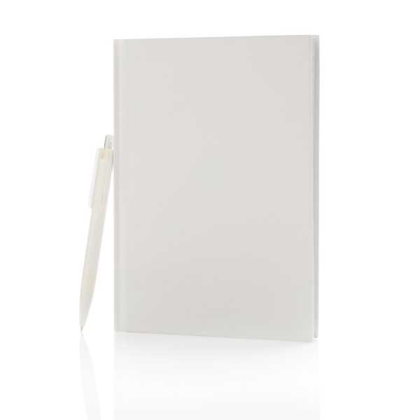 DIN A5 Notizbuch mit Hard Cover aus PU und 72 Blatt (144 Seiten) liniertem Papier. Elastisches Verschlussband und Lesebändchen. Mit passendem Druckkugelschreiber aus Metall. Blaue Tinte.