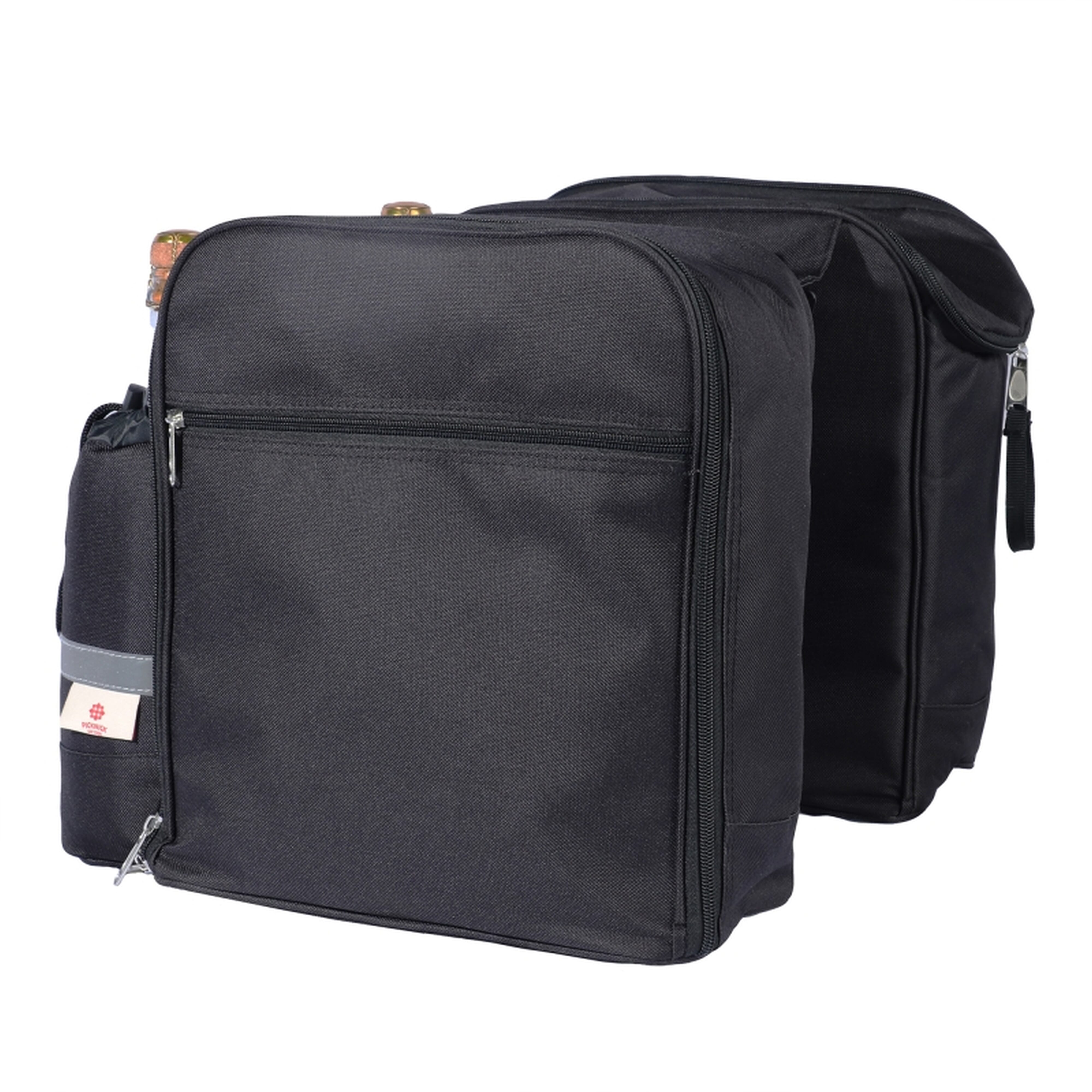 <p>Geräumige Doppel-Picknick-Fahrradtasche mit umfangreichem Essgeschirr auf der einen Seite. Das Fach auf der anderen Seite ist mit Isoliermaterial gepolstert. Die isolierten Flaschenhalter haben reflektierende Streifen für zusätzliche Sicherheit. Dank der Universalhaken kann diese Tasche an vielen Arten von Gepäckträgern, einschließlich E-Bikes, befestigt werden. </p><ul><li>Qualität: 600D</li></ul>