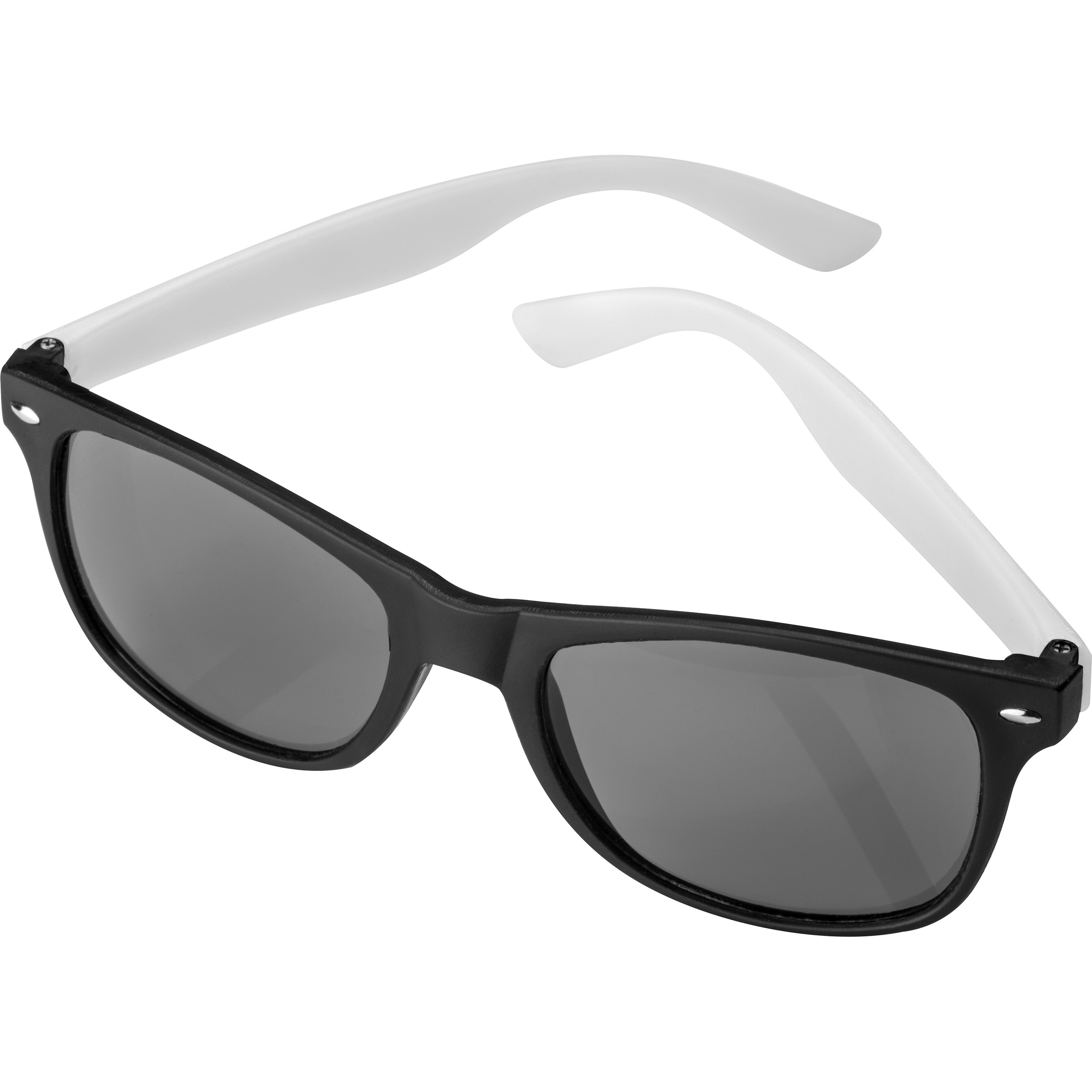 Stylische Sonnenbrille aus Kunststoff, zweifarbig mit verspiegelten Gläsern, die natürlich UV 400 Schutz der Filterkategorie 3 haben. Die Werbung wird außen auf den schwarzen Bügel gedruckt.