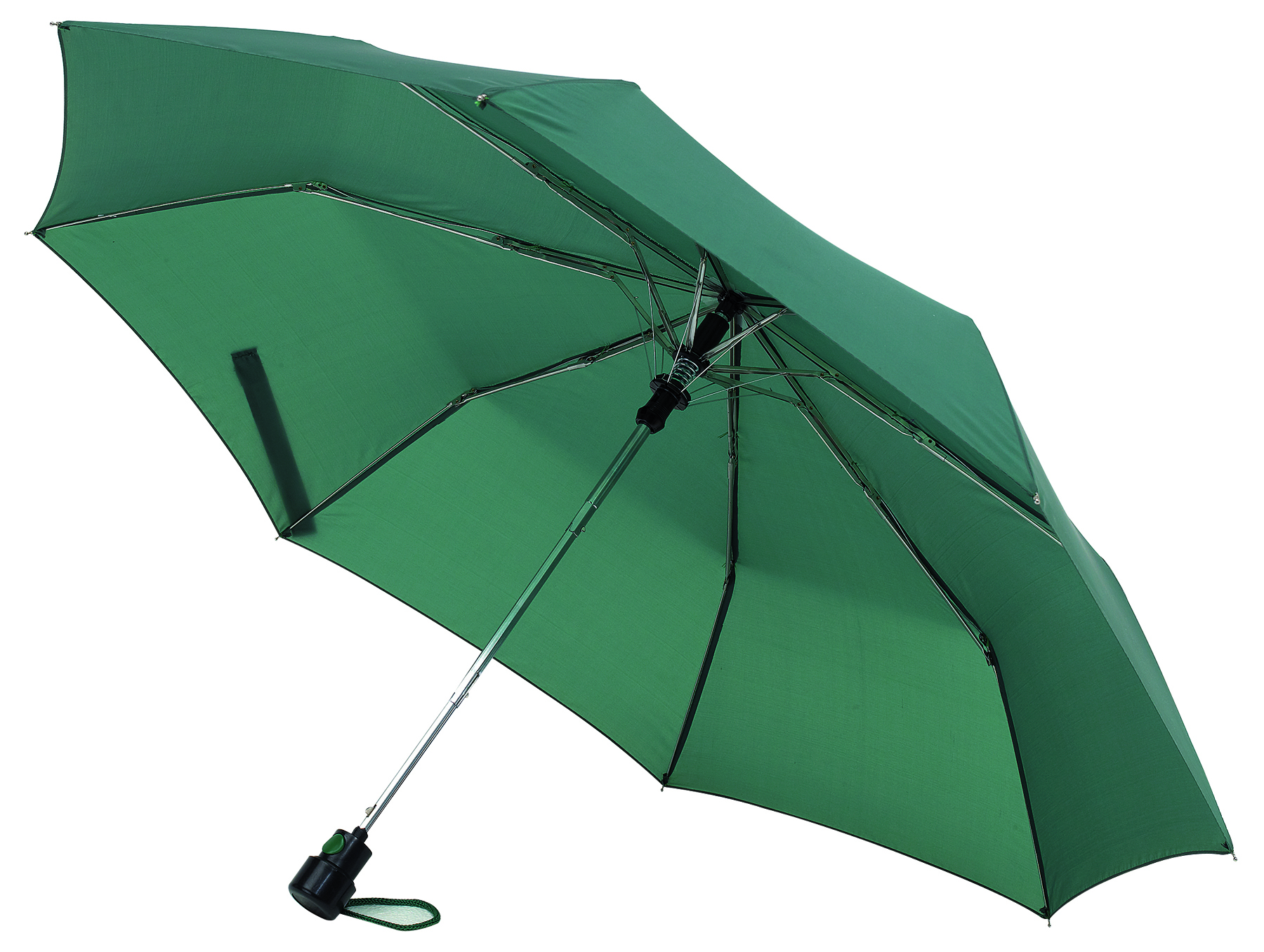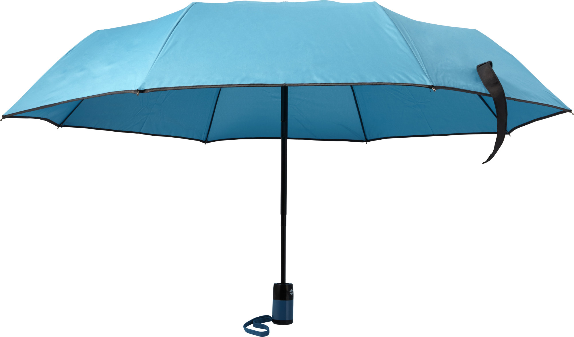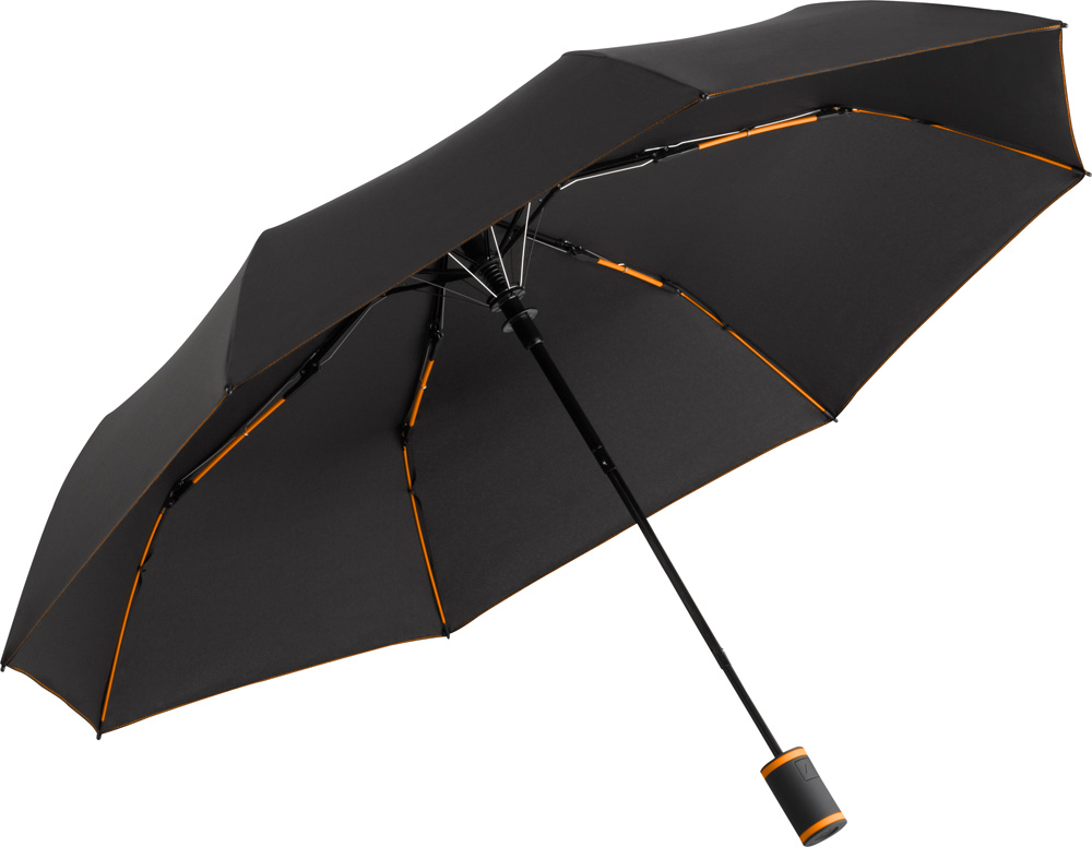 Faltbarer Automatik-Taschenschirm mit einer Bespannung aus Pongee (180T). Der Schaft und das Gestell sind aus Metall und der Handgriff ist aus Kunststoff.