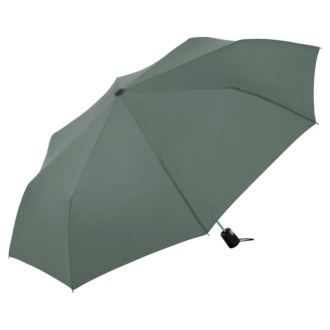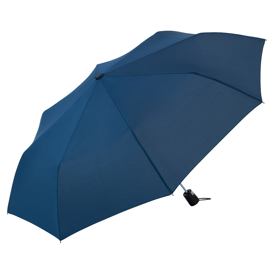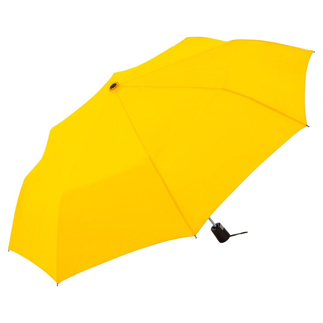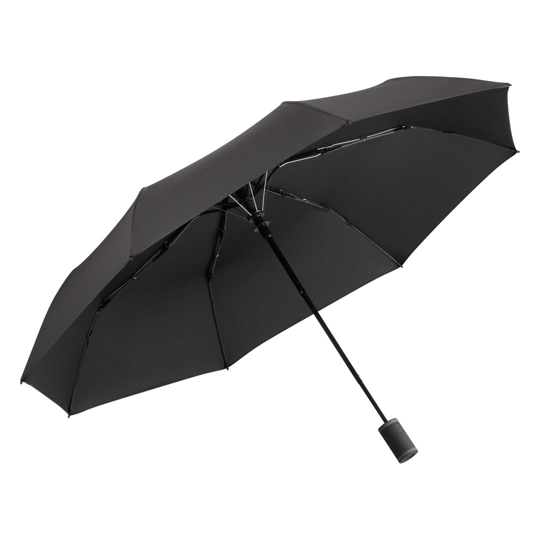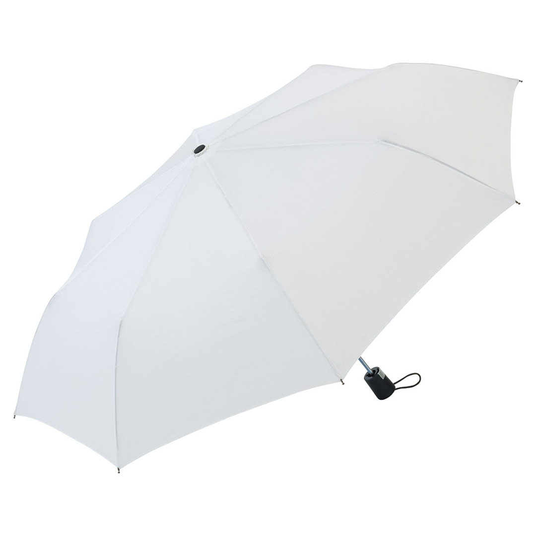 Vollautomatisch ein- und ausklappbarer Regenschirm mit 190T Pongee-bespannung, Schaft und Gestell aus Metall, Gummihandgriff mit Handschlaufe und Klettbandverschluss. In einer Aufbewarungshülle. Gefaltete Länge: 28 cm.