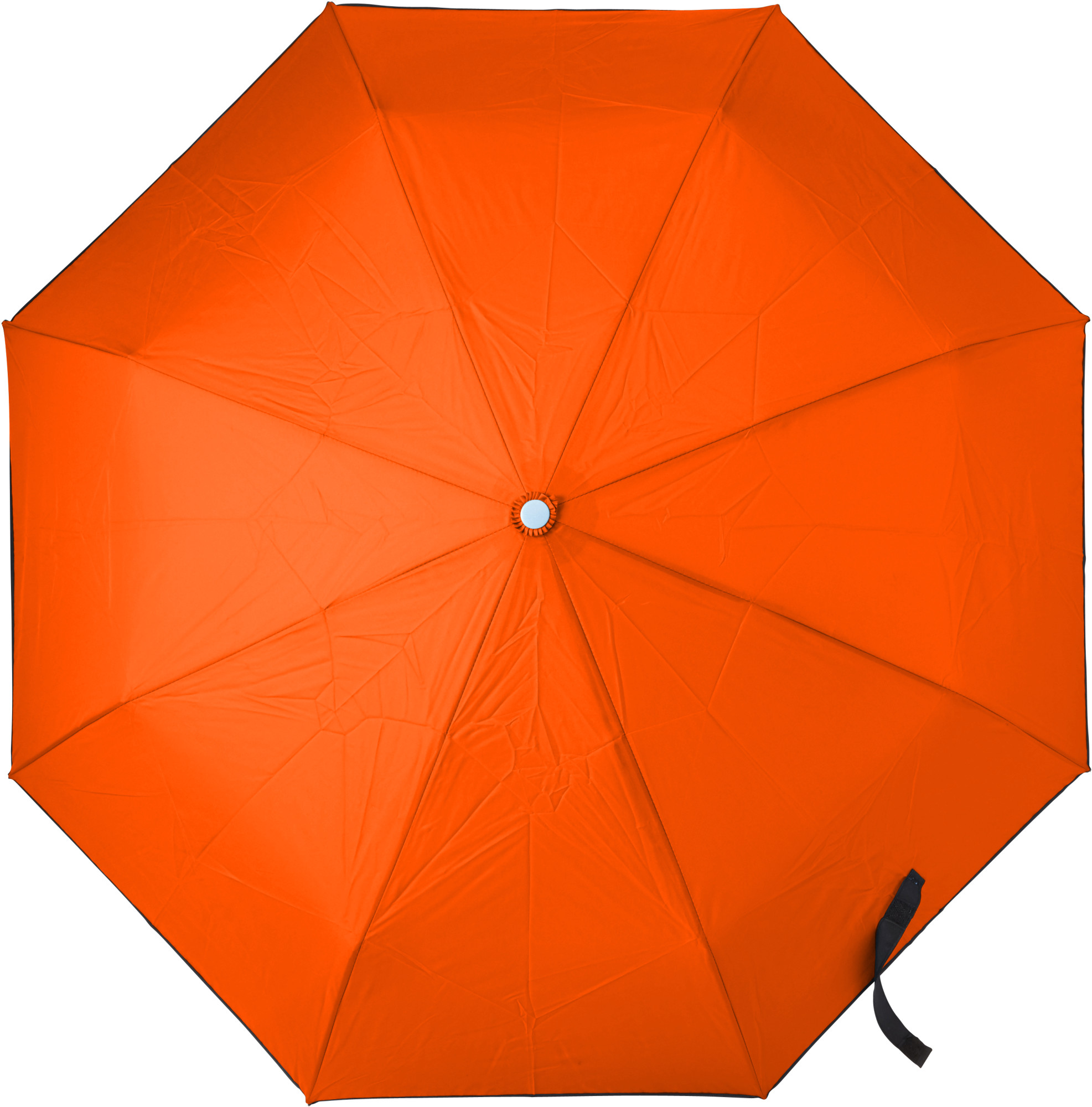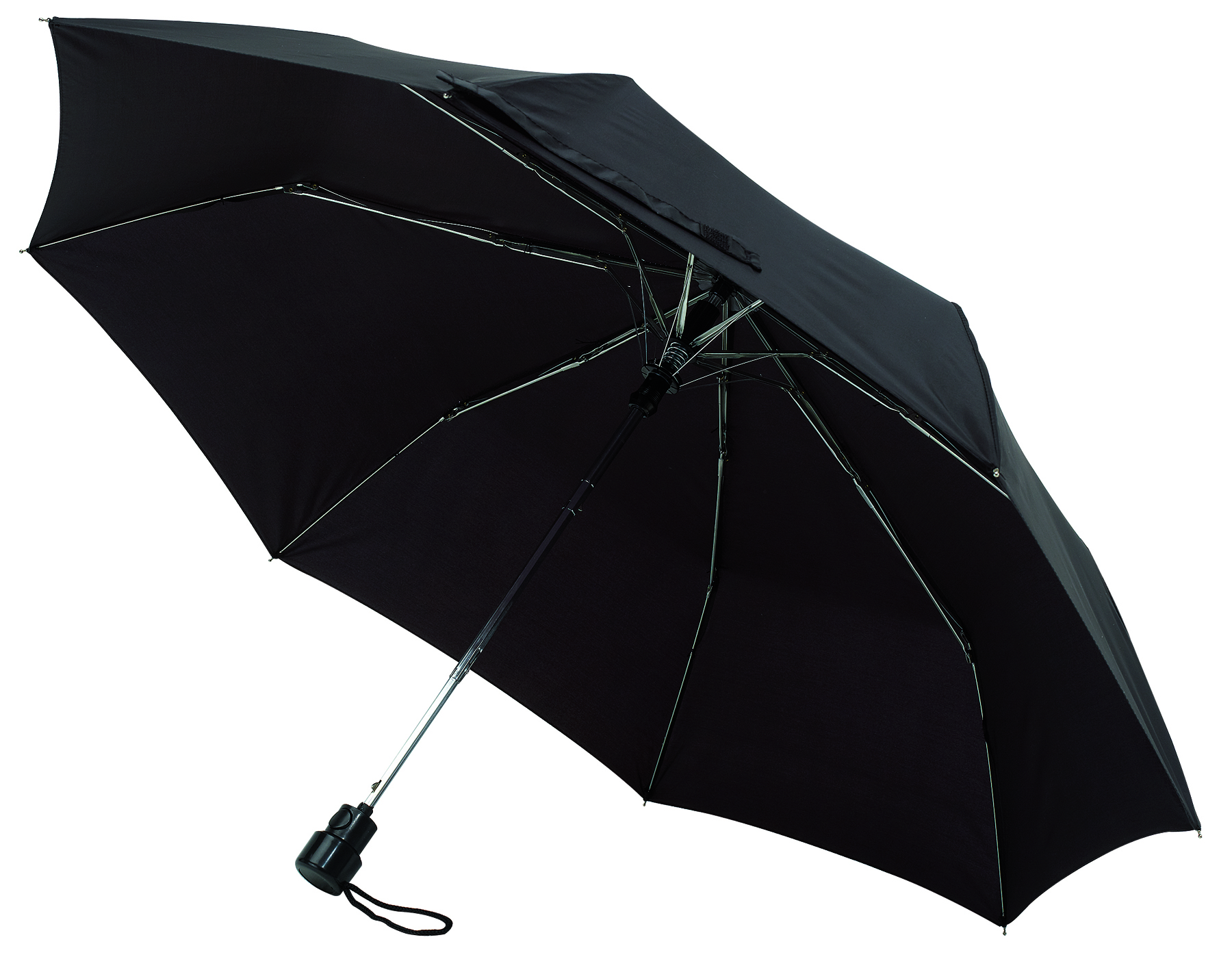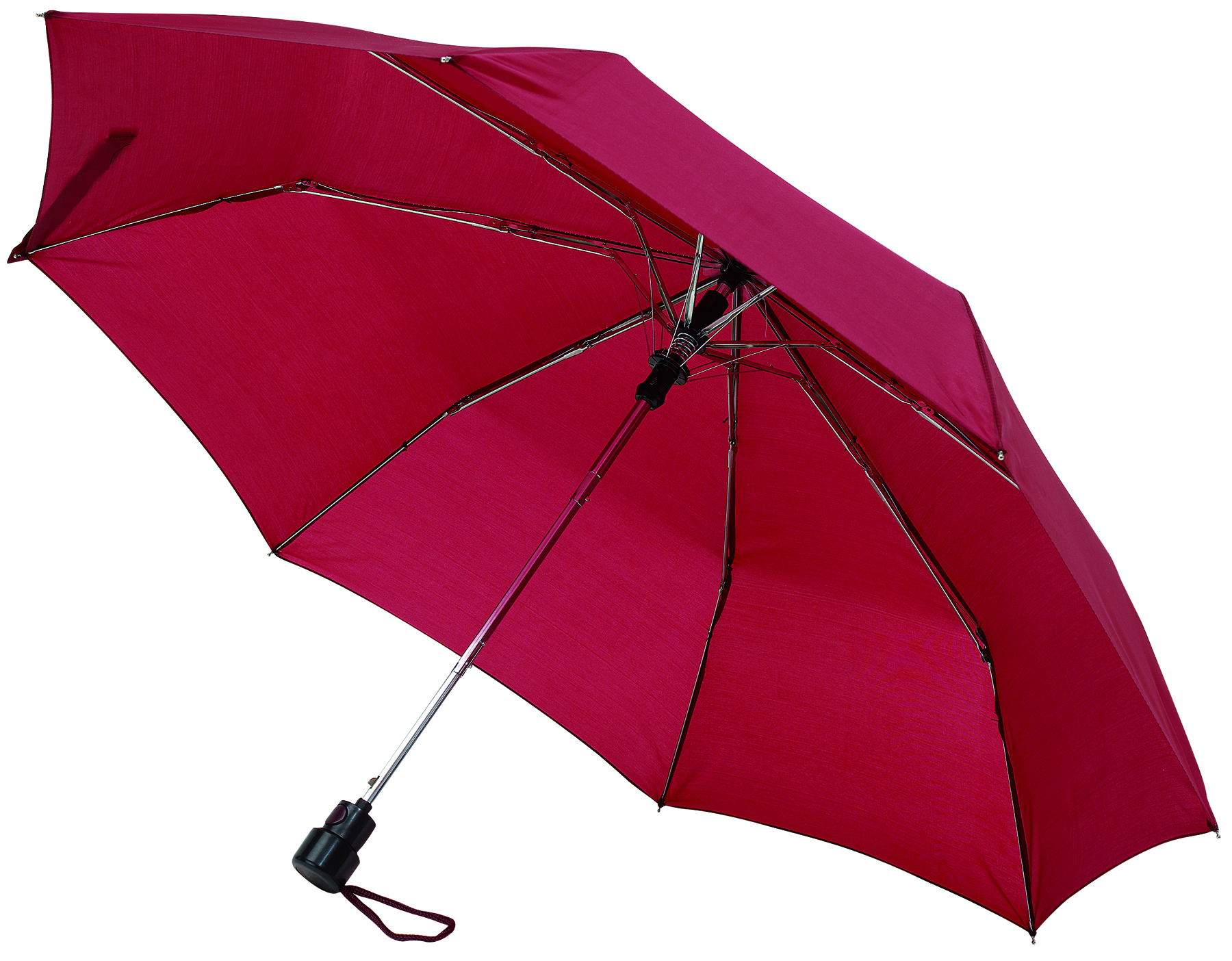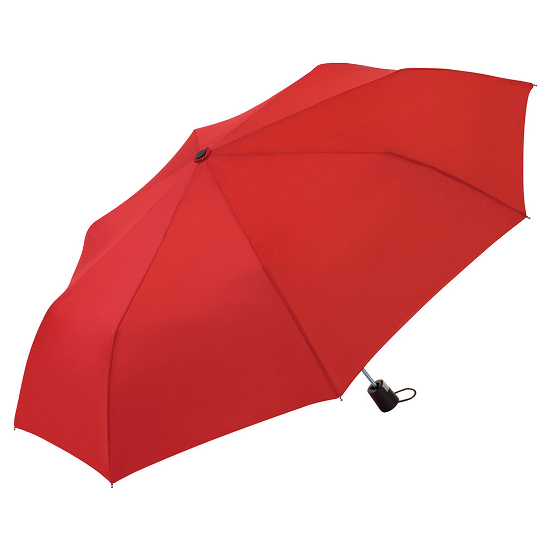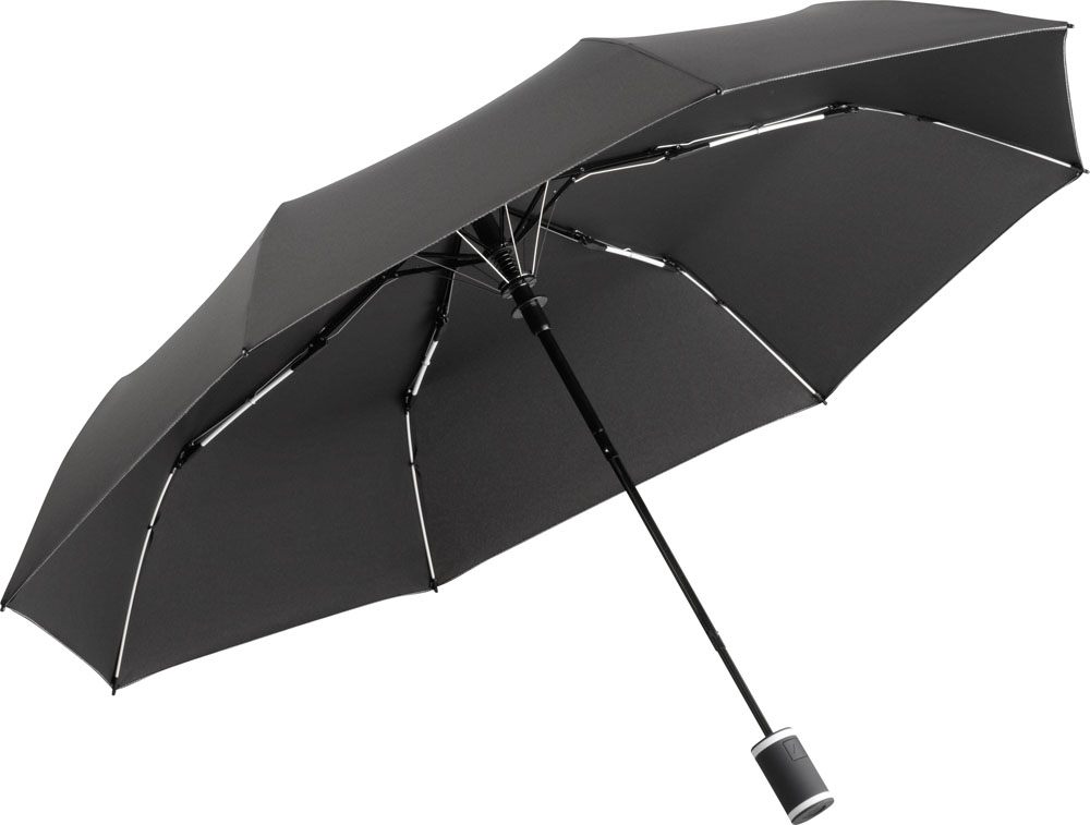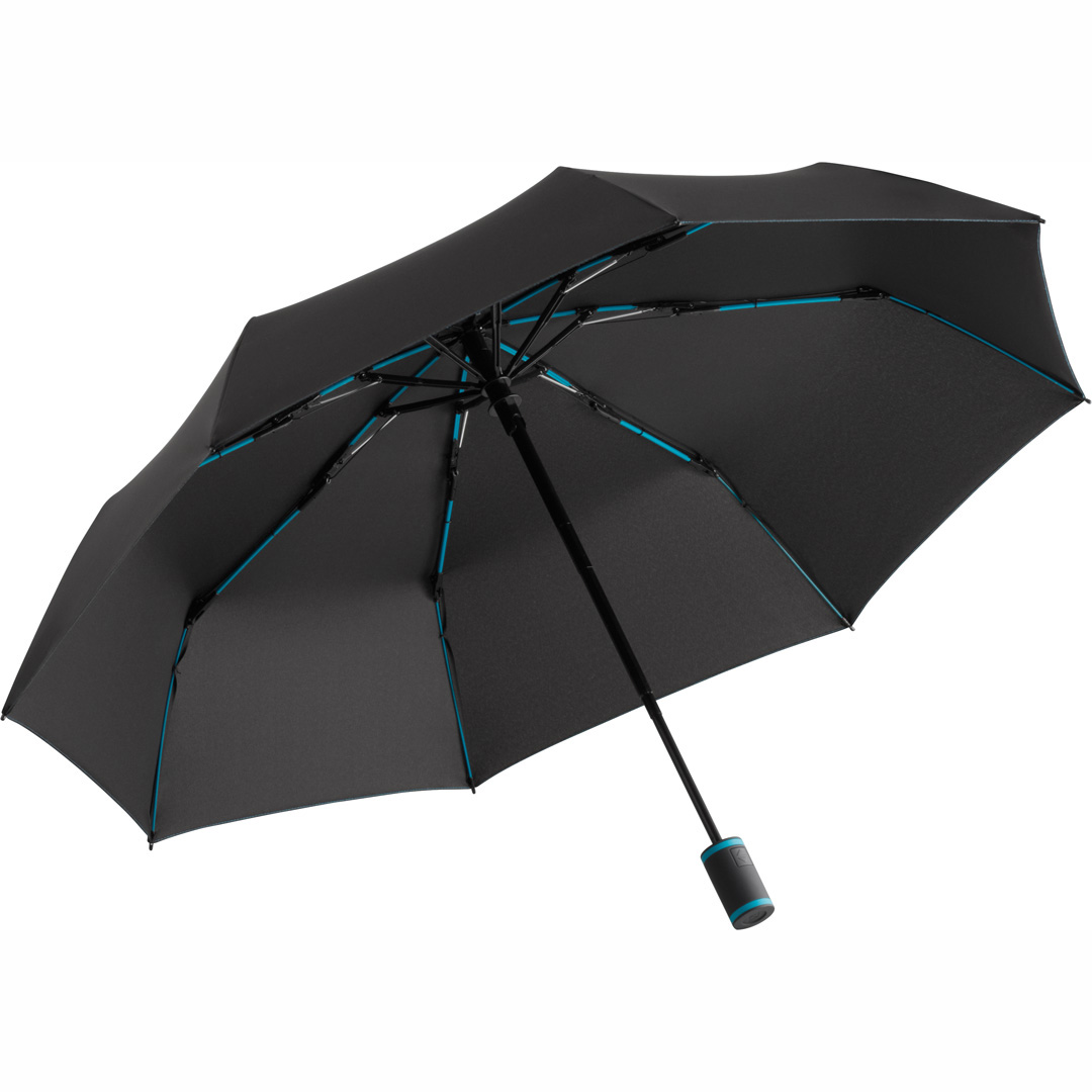 Vollautomatisch ein- und ausklappbarer Regenschirm mit 190T Pongee-bespannung, Schaft und Gestell aus Metall, Gummihandgriff mit Handschlaufe und Klettbandverschluss. In einer Aufbewarungshülle. Gefaltete Länge: 28 cm.