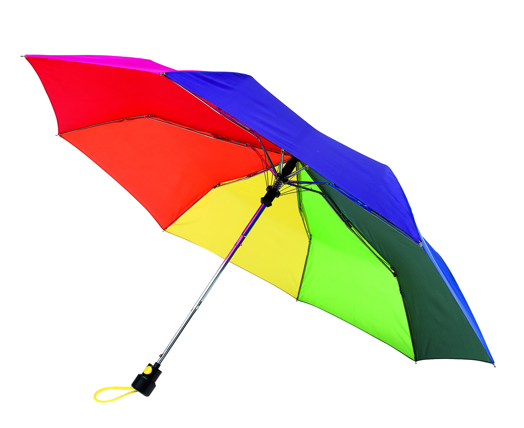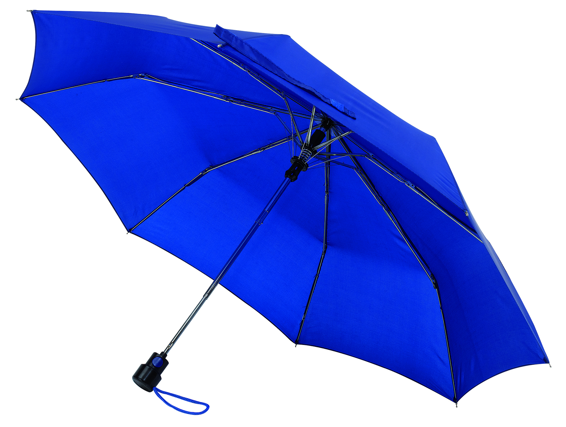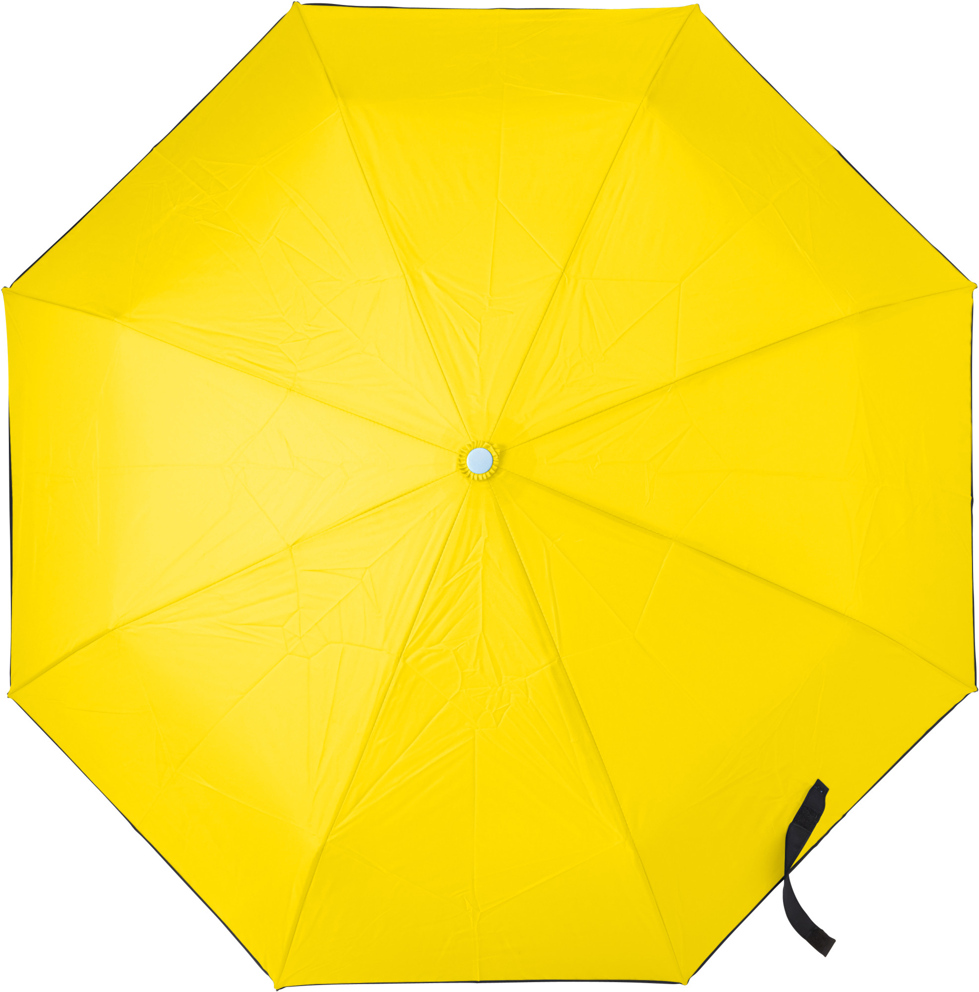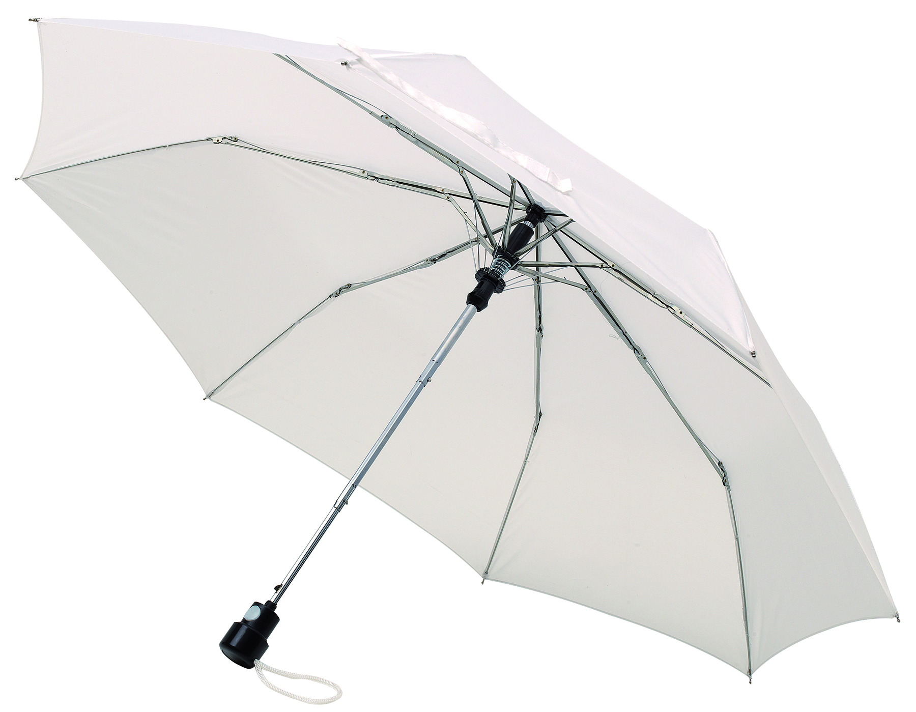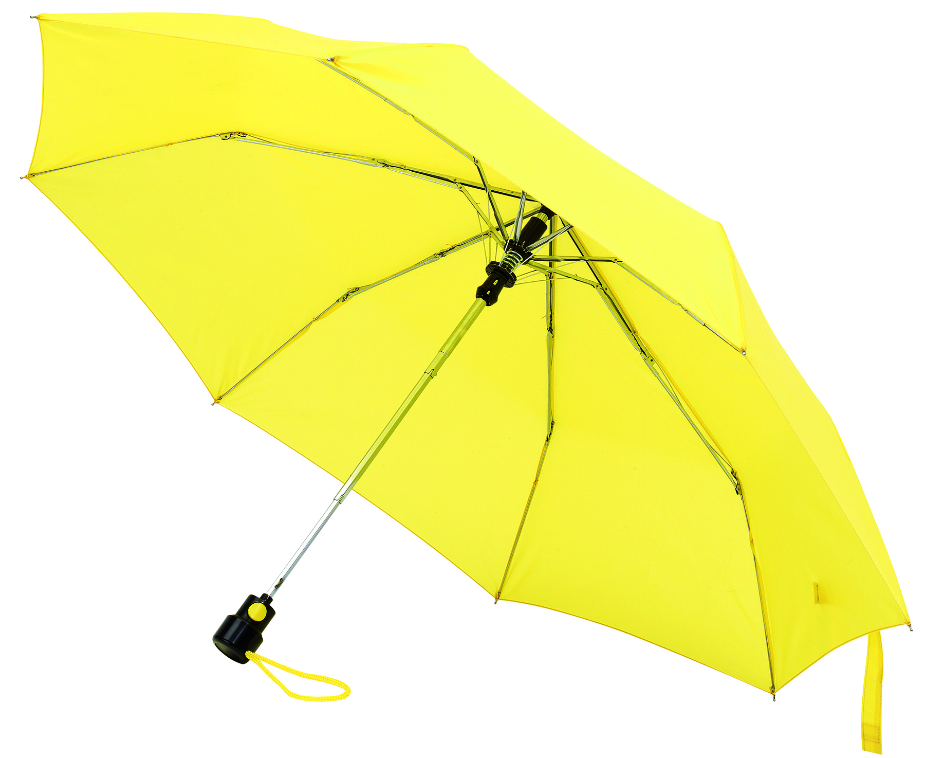 Vollautomatisch ein- und ausklappbarer Regenschirm mit 190T Pongee-bespannung, Schaft und Gestell aus Metall, Gummihandgriff mit Handschlaufe und Klettbandverschluss. In einer Aufbewarungshülle. Gefaltete Länge: 28 cm.