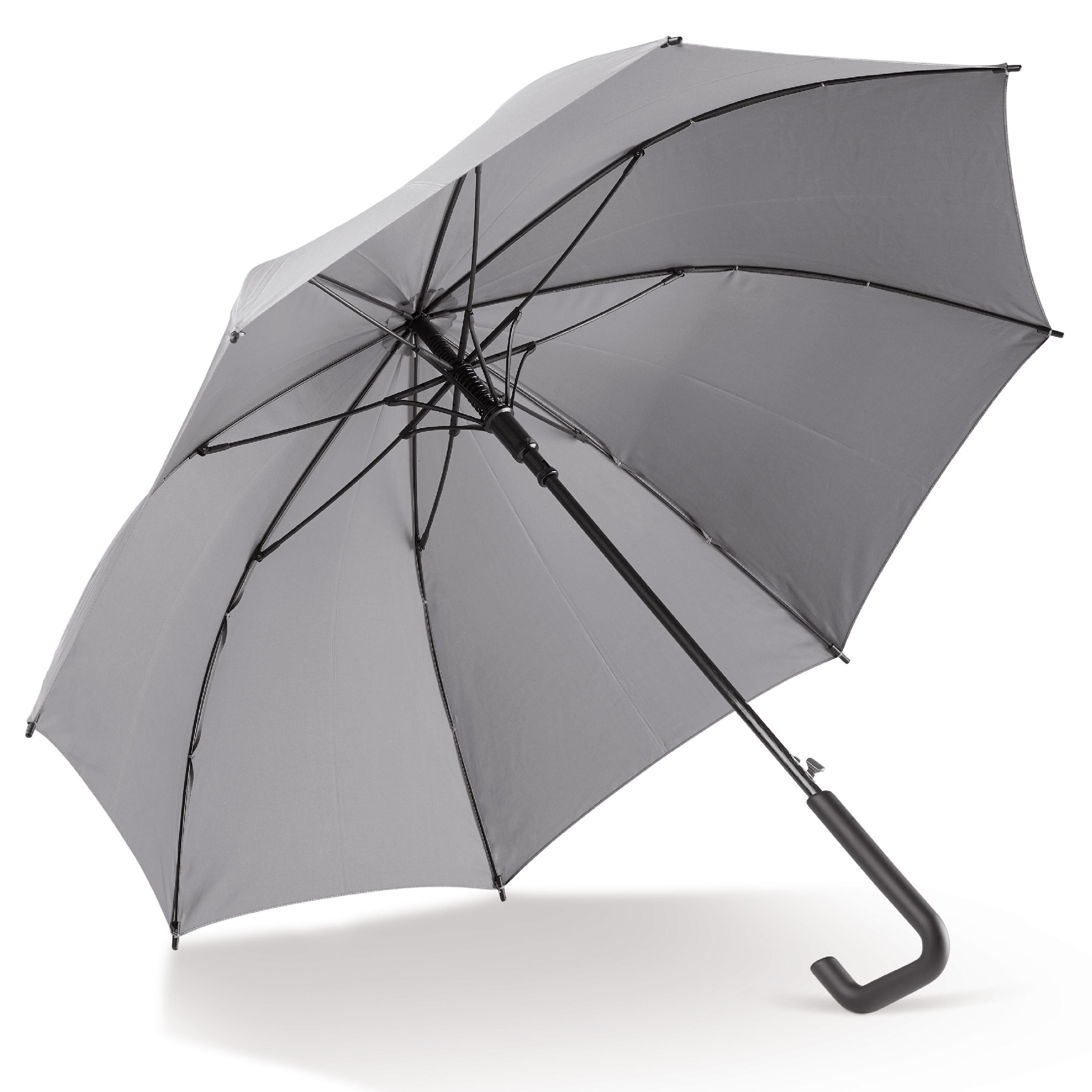 Regenschirm mit automatischer Teleskopöffnung. 190T Polyester-Bespannung, Fiberglasrahmen, Metallschaft, Klettverschluss, gebogenem, klassischem Handgriff, der durch die luxuriöse Gummiummantelung gut in der Hand liegt.