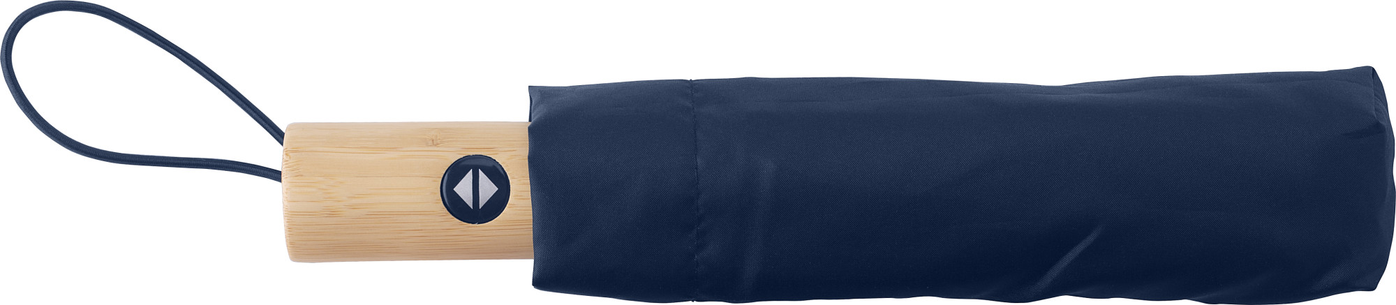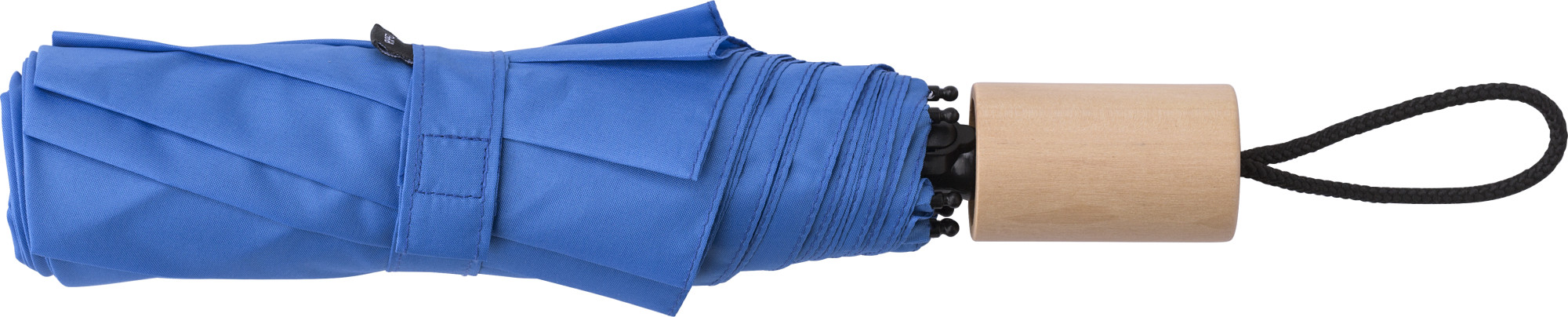 WoW! Faltbarer Regenschirm mit 190T RPET Pongee Polyester-Bezug. Mit mit einem Schaft und einem Gestell aus Edelstahl, einem Bambusgriff mit Baumwollschlaufe, Klettverschluss, Aufbewahrungshülle und RPET-Etikett. Manuelle Bedienung. RCS-zertifiziert. Recyceltes Material insgesamt: 18%.