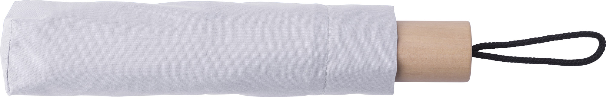 23 inch Regenschirm aus 190T Polyester. Stock, Spitzen und Krone aus Holz. Stangen aus schwarz überzogenem Metall. Gebogener Griff aus Holz in Natur-Finish. Manuelle Öffnung und Schließung.