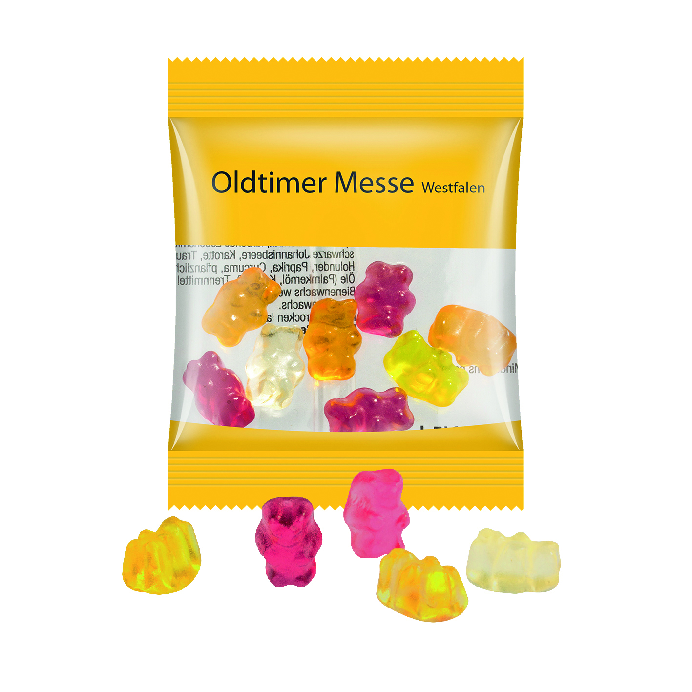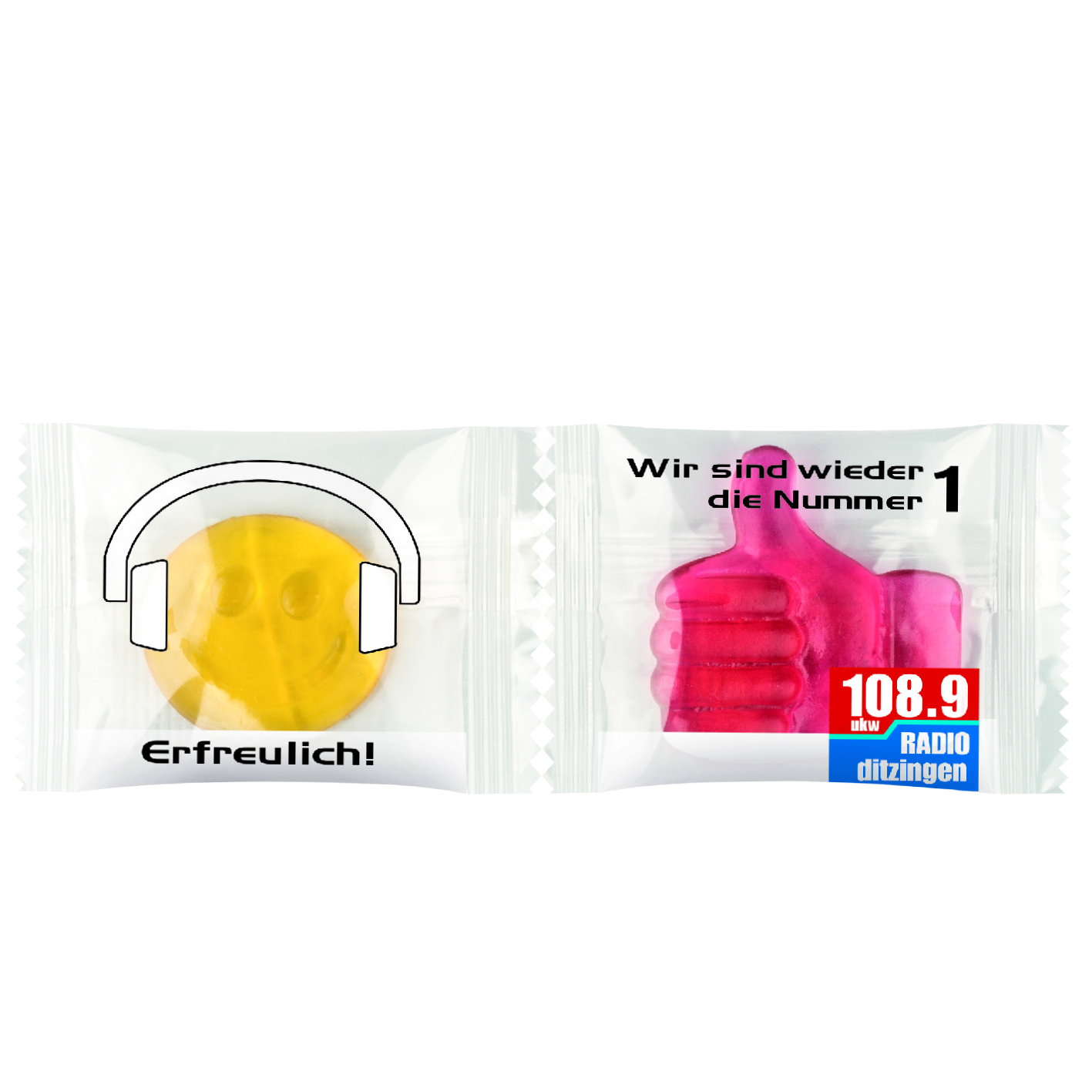 Produkt: Zwei Flowpacks aus transparenter Folie, als Kettenbeutel mit Perforation zum Abtrennen, individuell bedruckt br>Inhalt: Zwei Fruchtgummis der Marke Trolli in Standardform, Premium-Qualität, 10 % Fruchtanteil, ca. 24 g br>Sonderfarben-/Sondergeschmacksrichtungen auf Anfrage br>Haltbarkeit: 12 Monate br>Preise: € / Stück inkl. 4-c Digitaldruck zzgl. Drucknebenkosten
