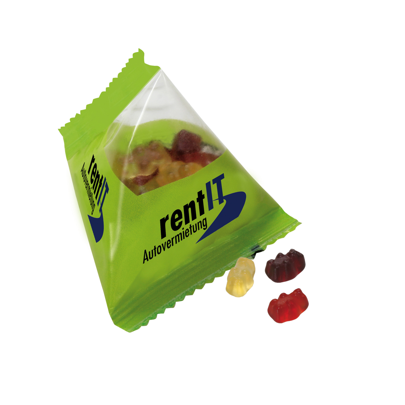 Produkt: Tetraeder aus weißer Folie, individuell bedruckt br>Inhalt: Gummibärchen der Marke Trolli in Fruchtsaft-Qualität-Exquisit mit 30 % Fruchtanteil, bunt gemischt, ca. 15 g br>Haltbarkeit: 12 Monate br>Preise: € / Tetraeder inkl. 4-c Digitaldruck zzgl. Drucknebenkosten.