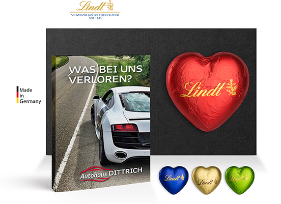 6 Gründe dafür, Werbekarte mit Lindt Schokoladen Herz 20 g mit Ihrem Logo bei Promowerk-Werbeartikel.com bedrucken zu lassen.