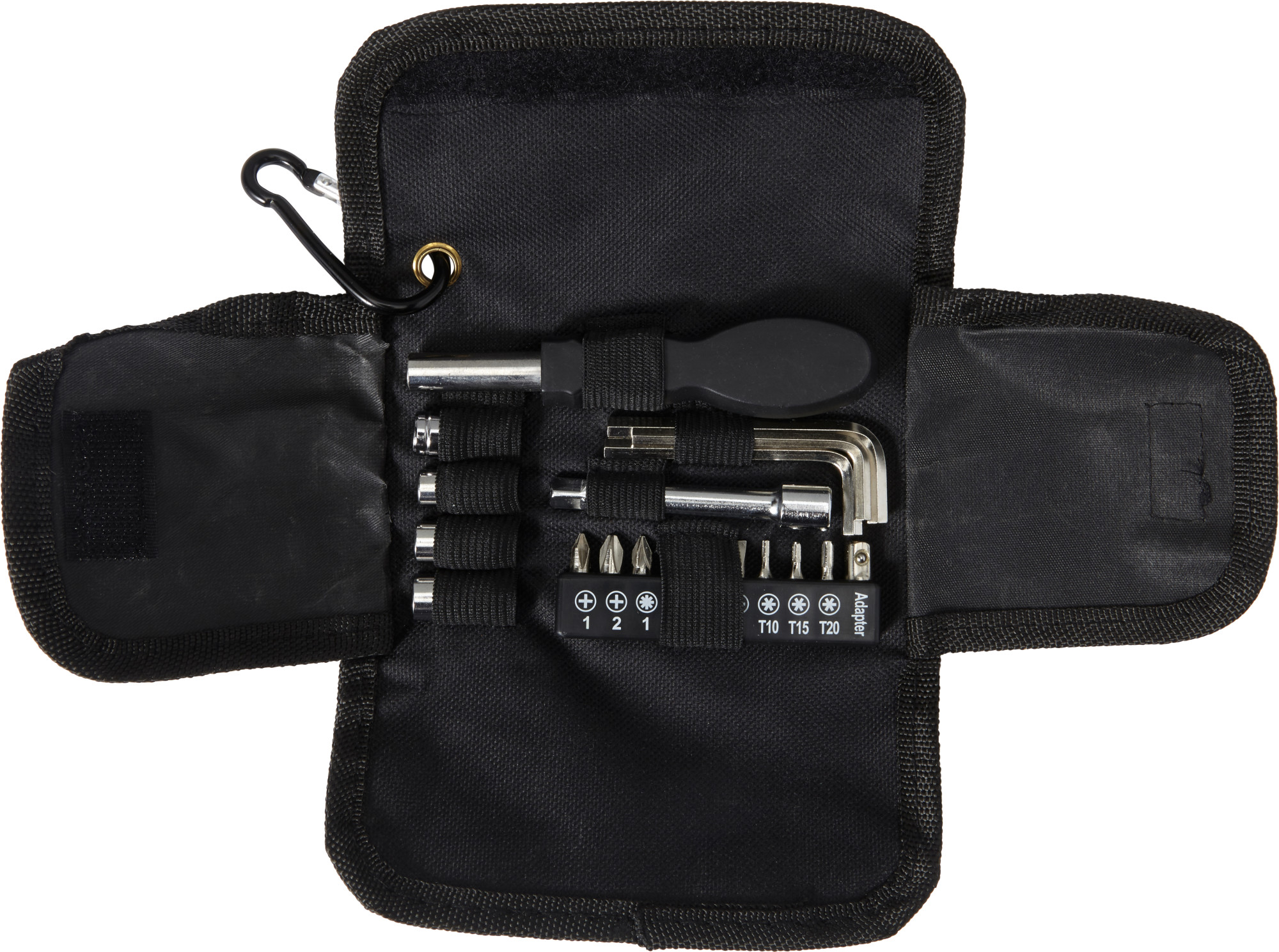 Werkzeug-Set (20-tlg.) in Werkzeugtasche aus Oxfordgewebe (600D) mit Klettverschluss und Karabinerhaken. Das Set besteht aus Schraubendreher (verschiedene Aufsätze), 3 Inbusschlüsseln, 4 Nüssen, 10 Biteinsätzen und Verlängerungsstück.