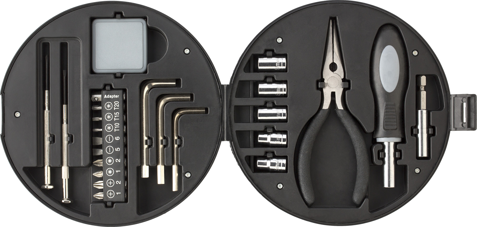 Werkzeug-Set aus Kunststoff bestehend aus 2 Feinmechaniker-Schraubendrehern, Maßband, 3 Inbusschlüsseln, Flachzange, 10 Biteinsätzen, 5 Metall-Nüssen und Knarre.