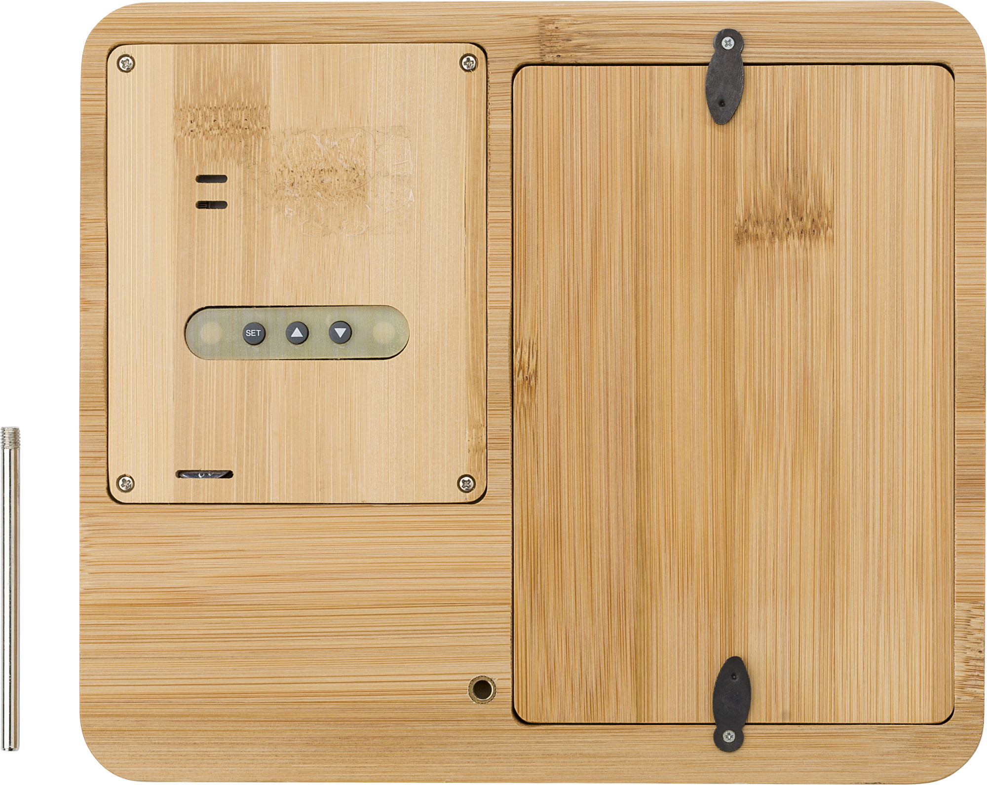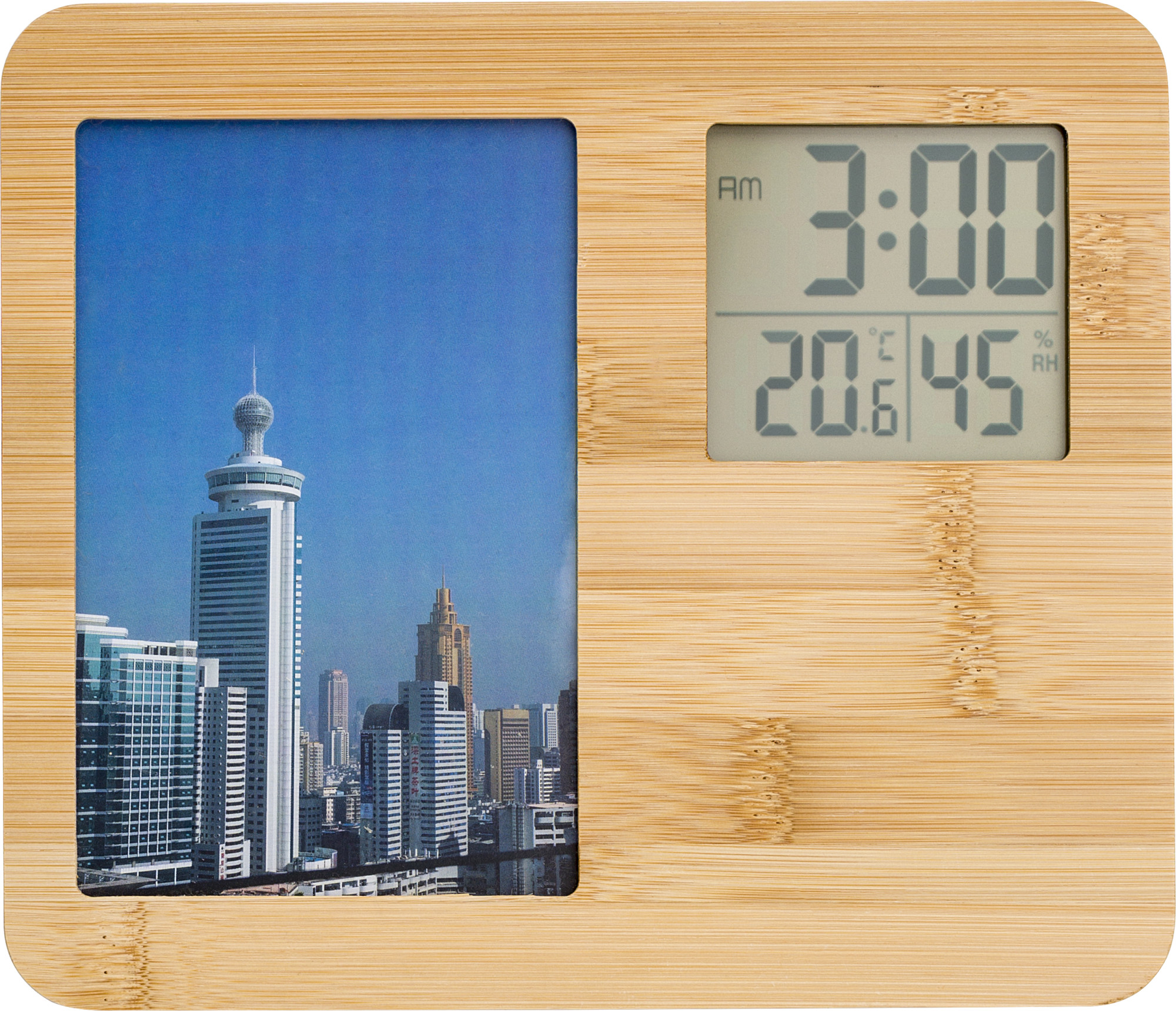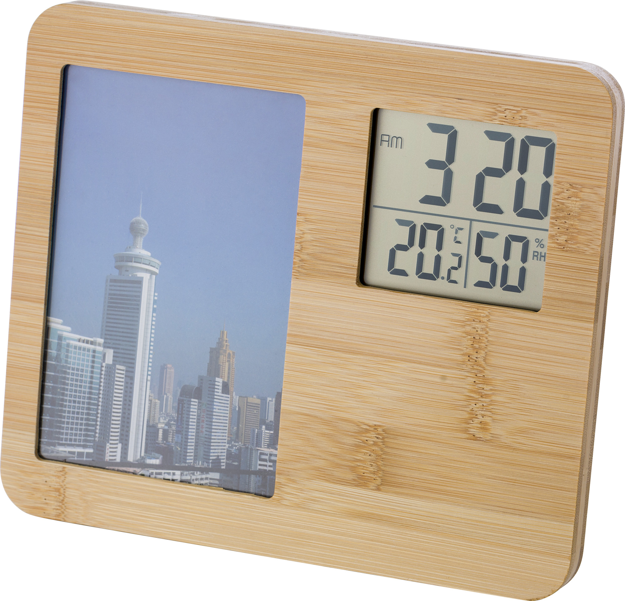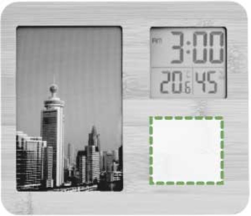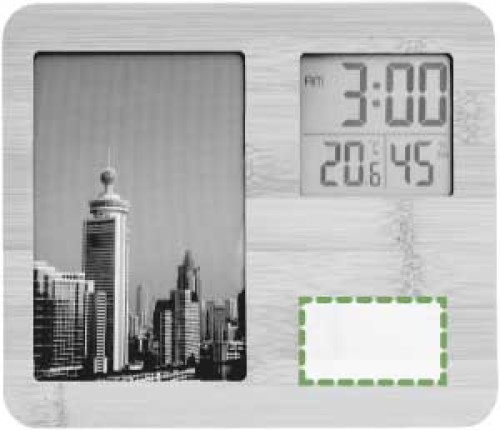 Wetterstation aus Bambus mit Fotorahmen. Funktionen: Uhr, Temperatur und Luftfeuchtigkeit. Geeignet für Fotos im Format 9x14cm. Fotoformat 15 x 10 cm. Inklusive Batterien.