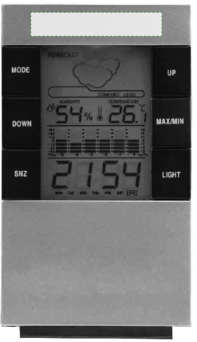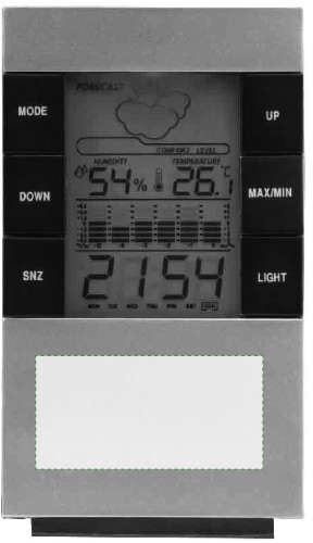 Wetterstation aus Kunststoff, LCD-Display mit Uhrzeit- und Tagesanzeige, Hydrometer, Wettervorhersage, Thermometer, Alarmfunktion, Aufhängeöse und Standfuß.