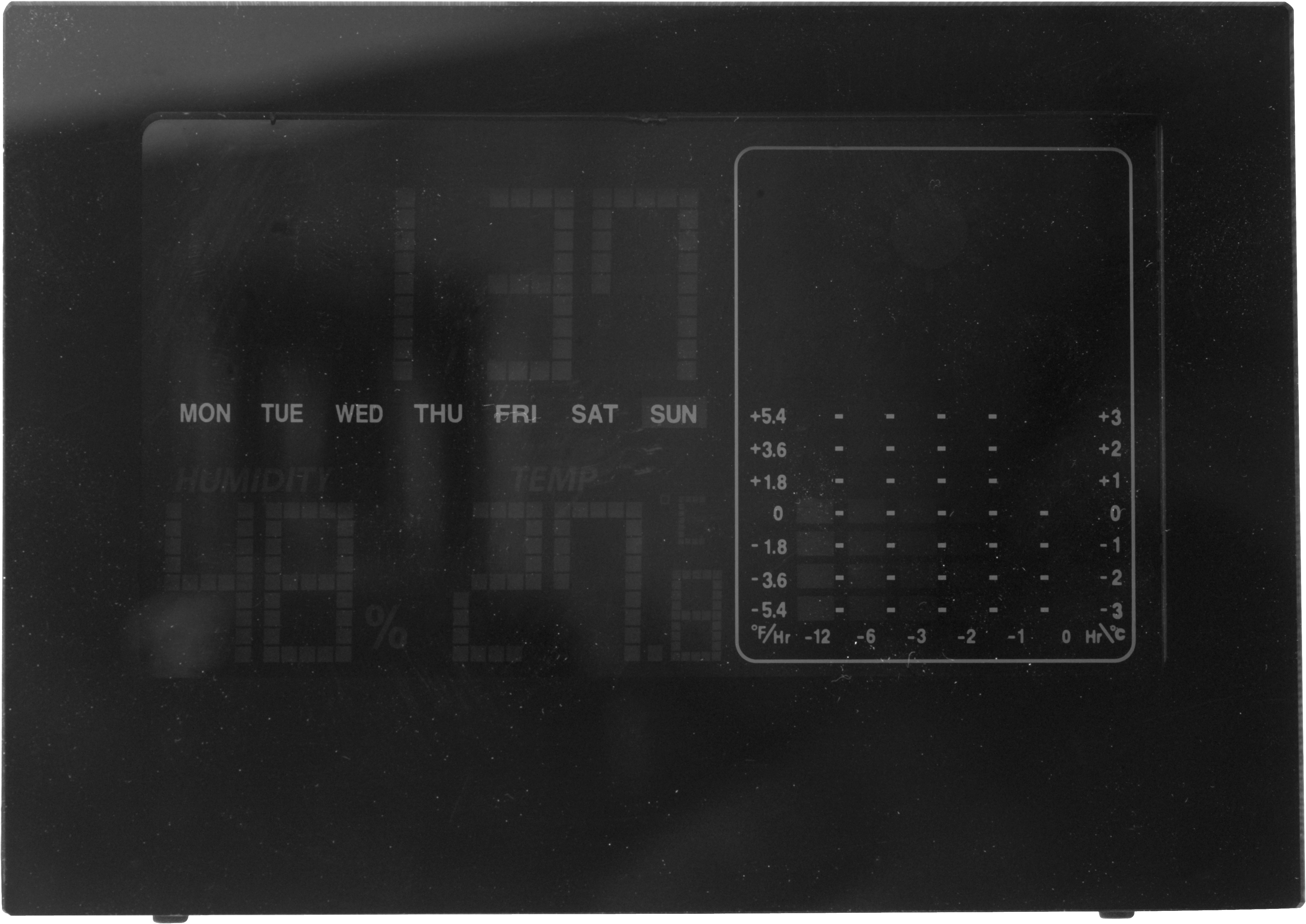 Wetterstation aus Kunststoff, LCD-Display mit Uhrzeit- und Tagesanzeige, Barometer, Thermometer und Alarmfunktion.
