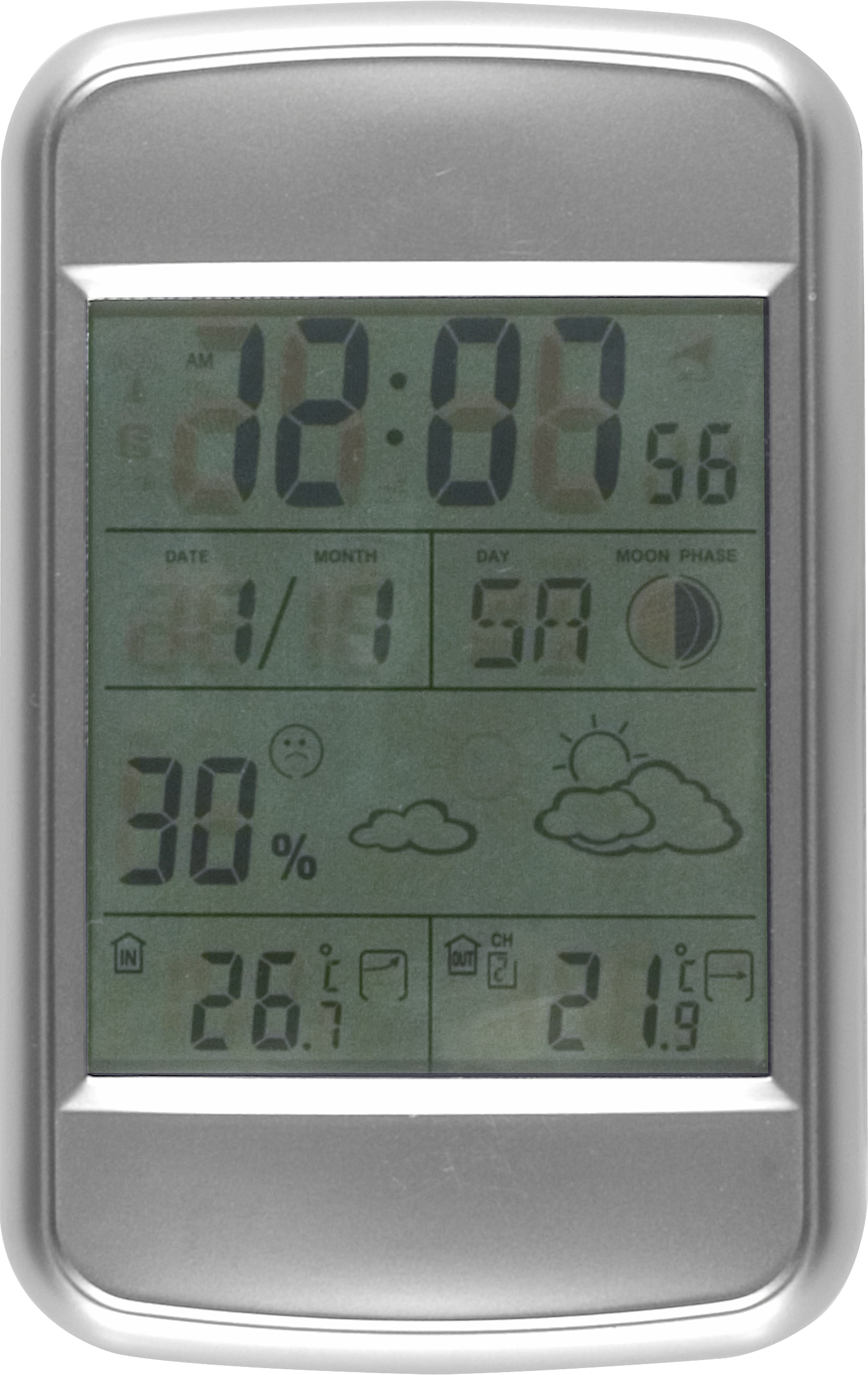 Wetterstation mit Außenfühler aus Kunststoff, LCD-Display mit Uhrzeitanzeige, Barometer, Temperaturanzeige (Innen und Aussen) und Mondanzeige.