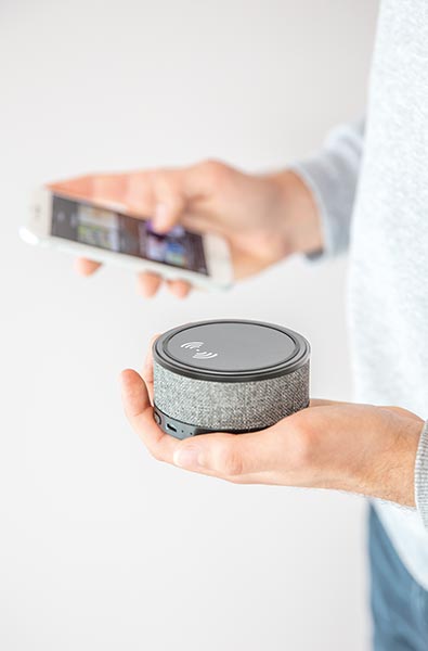 Lorem Ipsum Text6 Gründe dafür, Wireless-Charger mit Lautsprecher im trendigen Stoffbezug mit Ihrem Logo bei Promowerk-Werbeartikel.com bedrucken zu lassen.