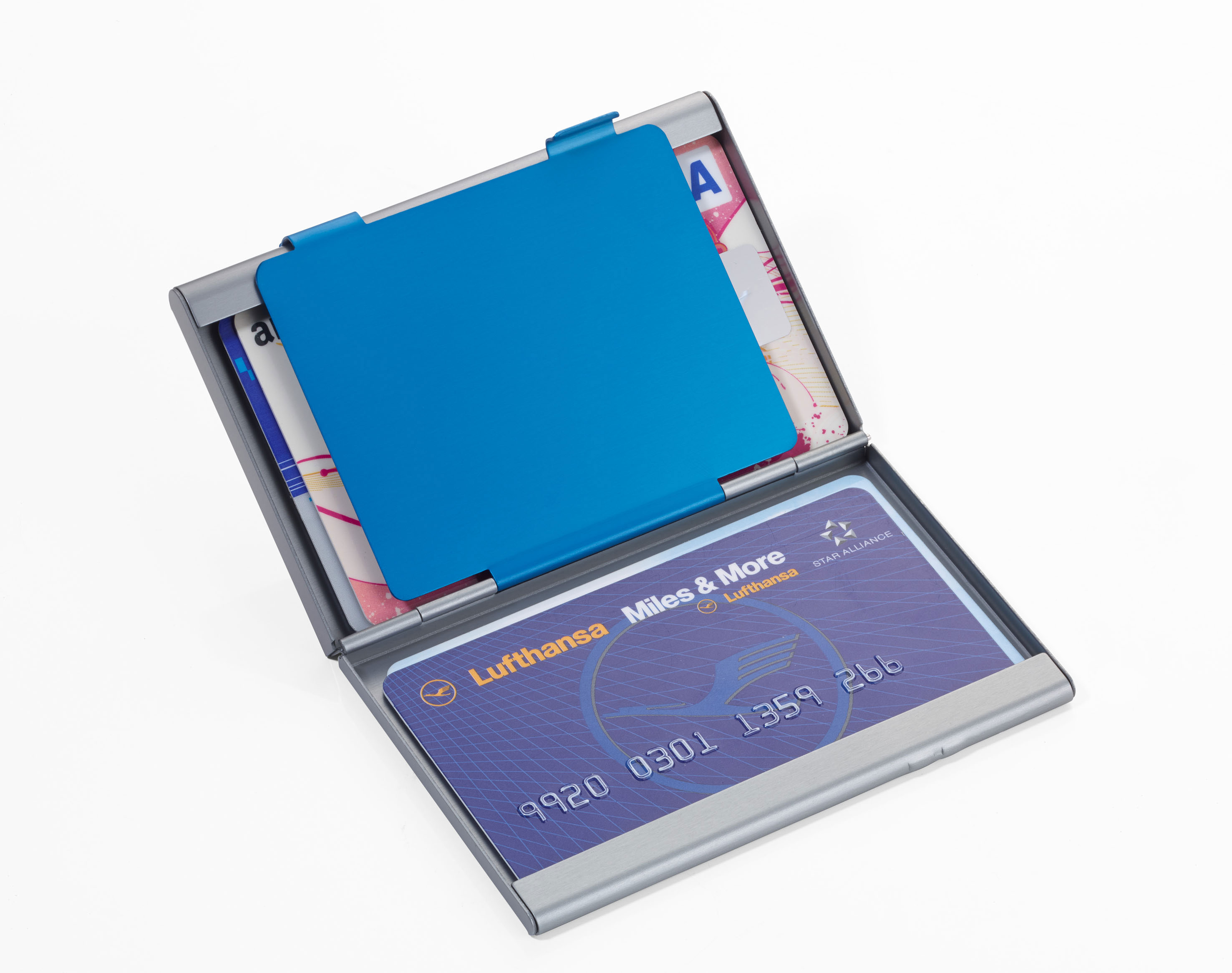 Visitenkartenetui mit farbiger Trennwand, für eigene/fremde Visitenkarten, für ca. 21 Karten, Aluminium, eloxiert, matt, blau/titanfarben Das elegante Visitenkartenetui verblüfft mit inneren Werten. Wo sonst gepflegtes Karten-Chaos herrscht, trennt hier ein farbiges Register eigene von fremden Visitenkarten. Oder Visitenkarten von Kreditkarten. Oder Shopping- von Clubkarten. Oder, oder, oder … Wer sagt jetzt noch, dass Style nicht praktisch sein kann?